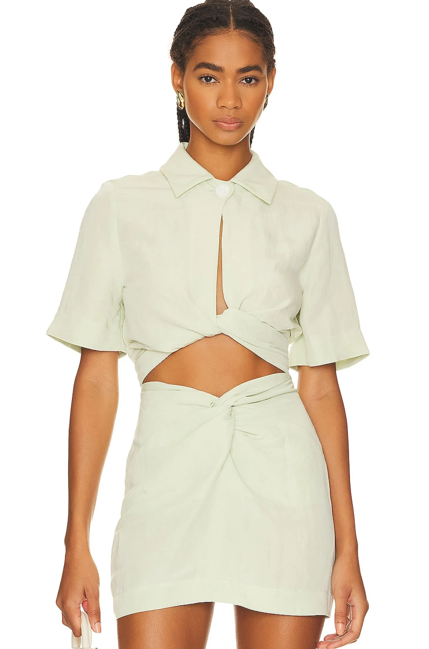 50% viscose 50% linen.Made in USA.Dry clean only.Singular front button closure at neckline.Wrap tie closure at hem.Lightweight linen fabric.Item not sold as a set