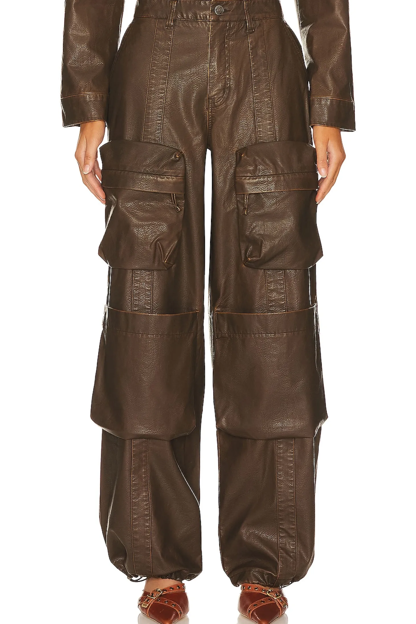 Self: 100% polyurethane Lining: 100% rayon.Made in China.Machine wash.Zip fly with button closure.Cargo style pockets.Adjustable pull cord hem.Item not sold as a set.24" at the knee narrows to 22" at the leg opening