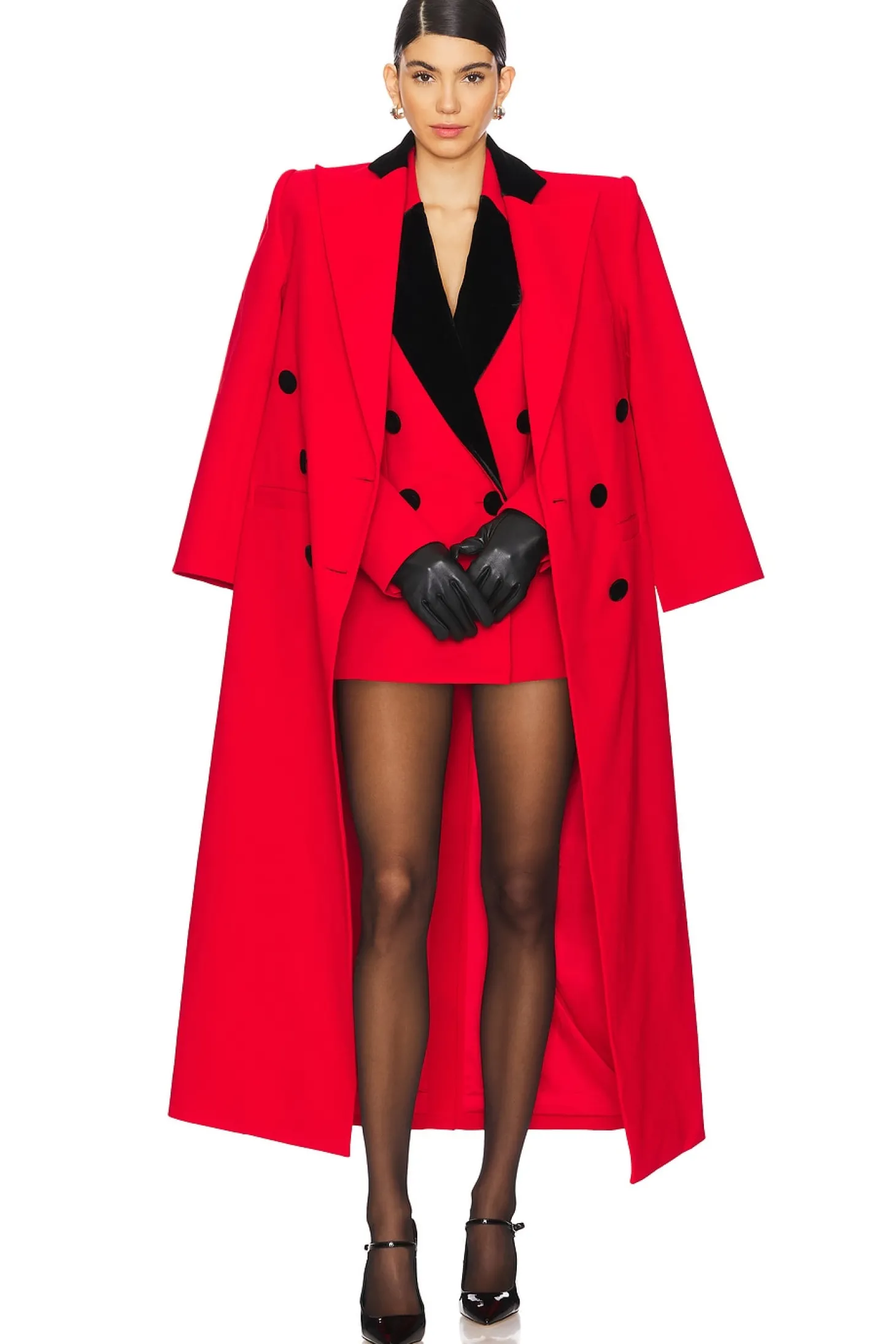 Self: 100% polyester Contrast Fabric: 70% viscose 26% polyamide 4% spandex Lining: 97% polyester 3% spandex.Made in China.Dry clean only.Double breasted closure.Front slip pockets and slip breast pocket Buttoned cuffs.Crepe fabric with padded shoulders and velvet contrast.Item not sold as set