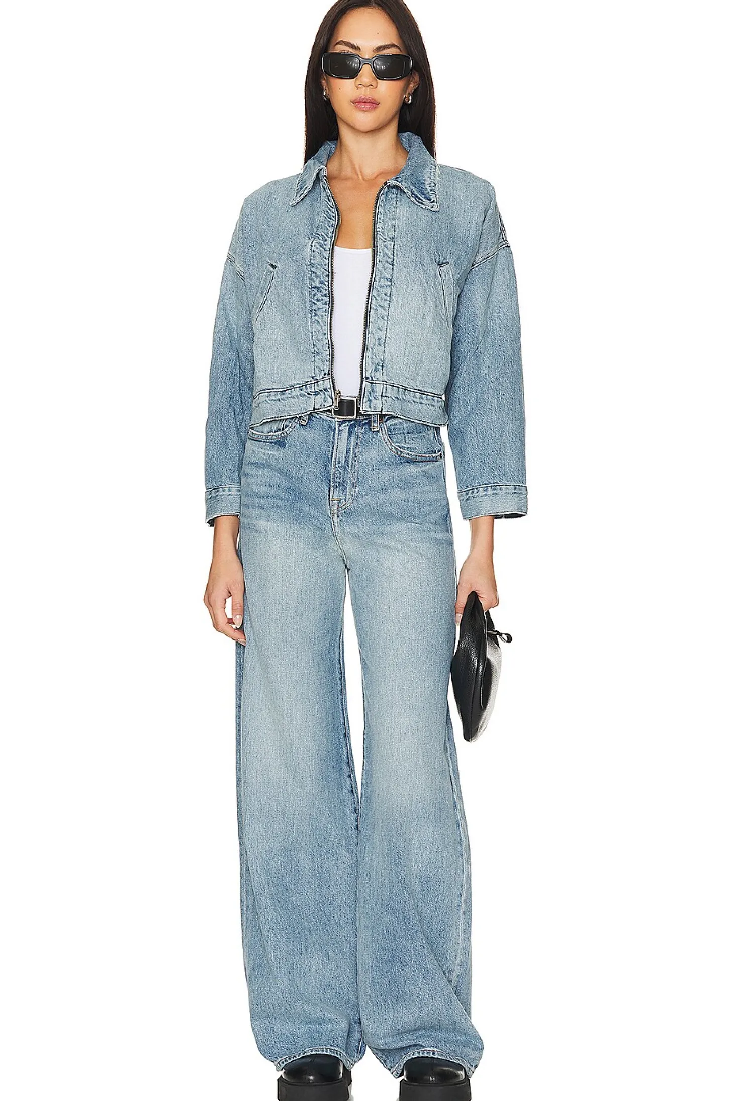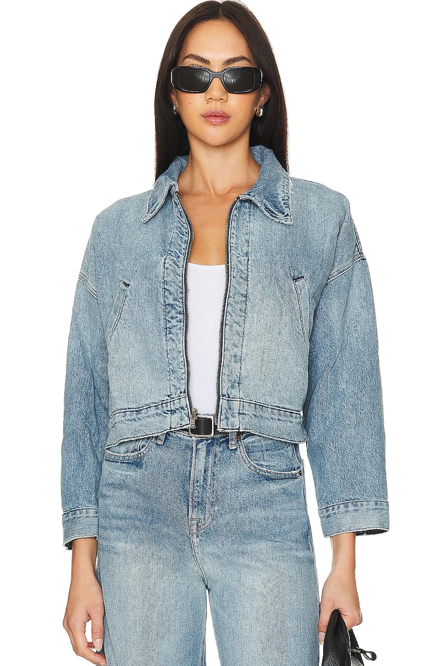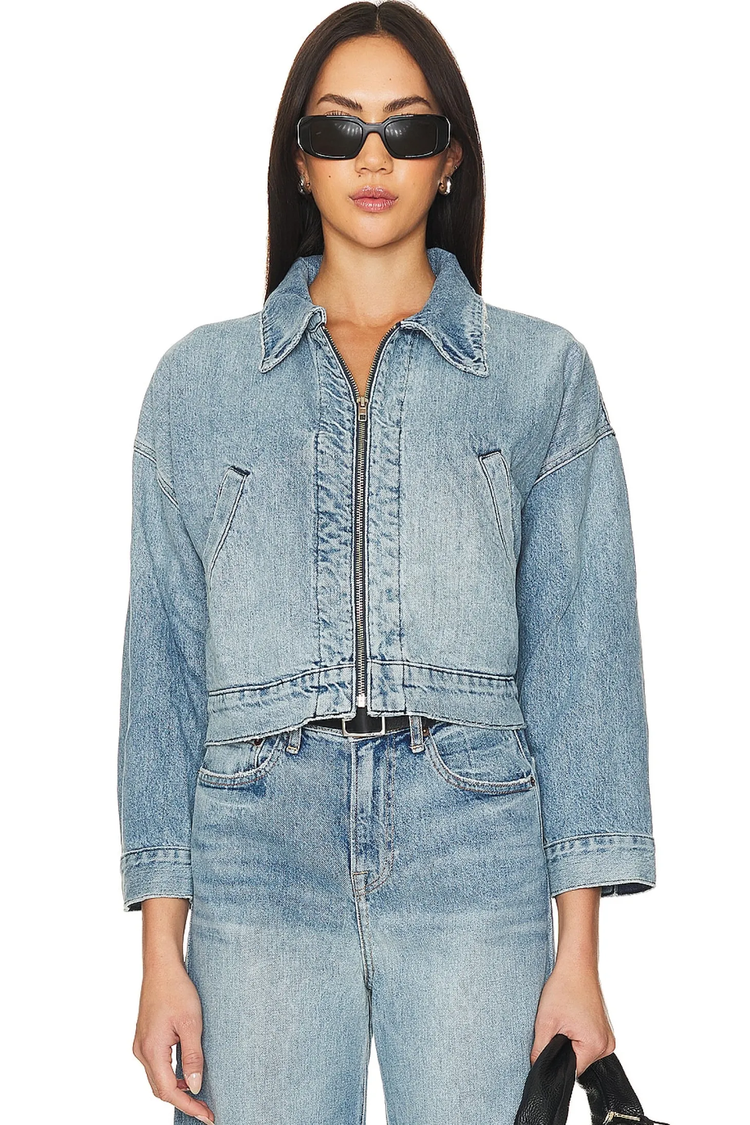 70% recycled cotton 30% viscose.Made in USA.Machine wash.Front zipper closure.Side slant pockets.Button cuffs.Rigid denim