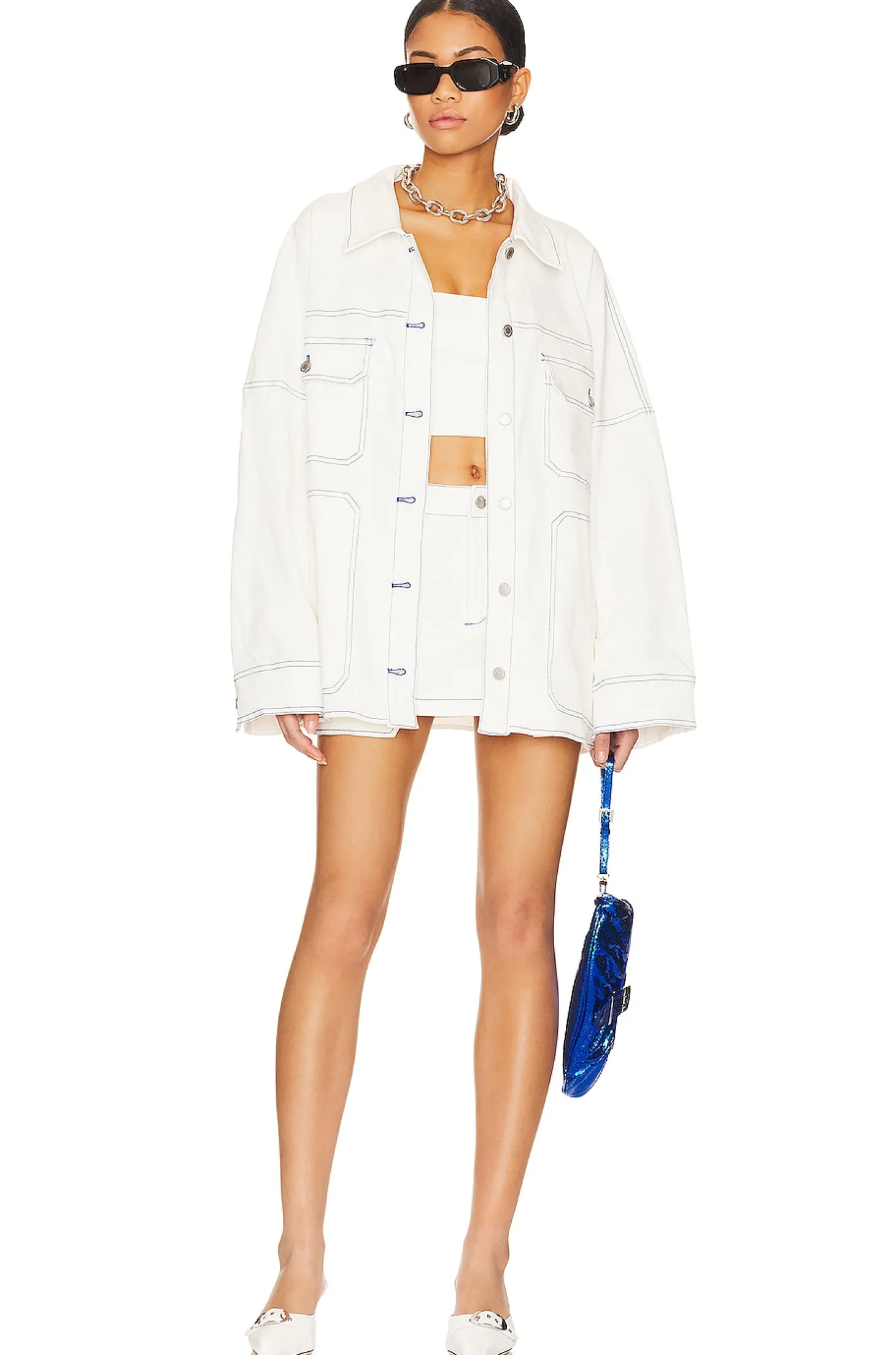 97% cotton 3% elastane.Made in China.Machine wash.Front button closure.4-pocket styling.Buttoned cuffs.Contrast stitching