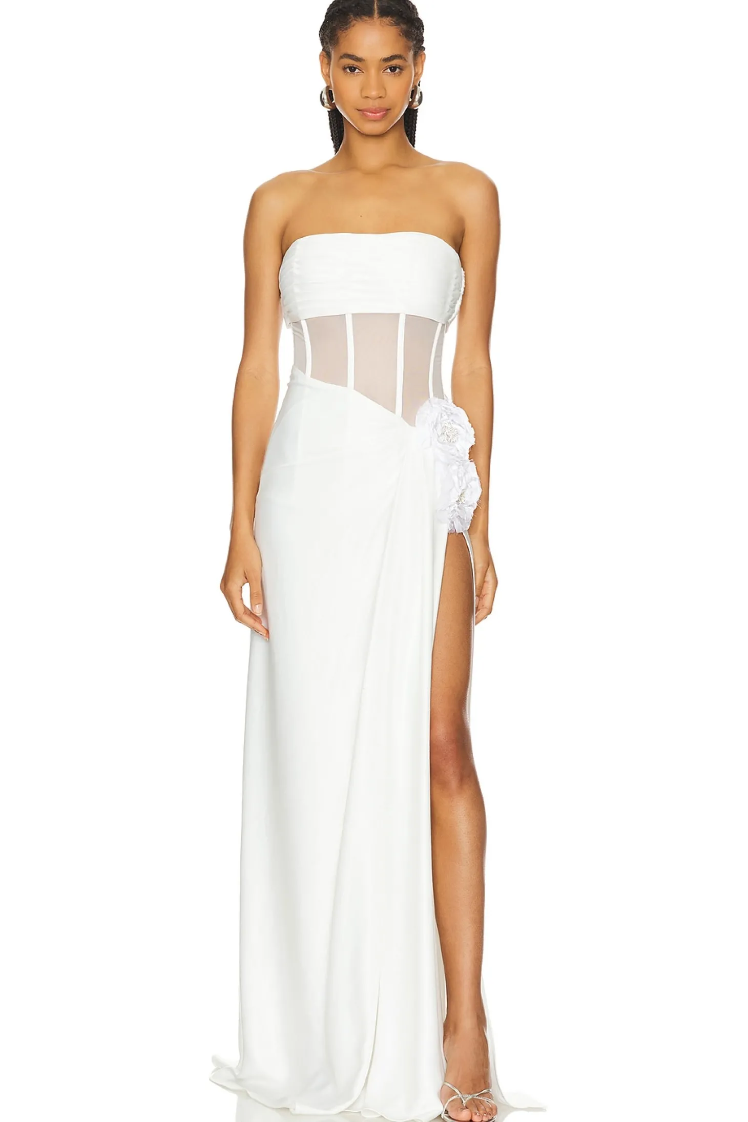 Self 1: 100% silk Self 2: 82% nylon 18% spandex.Made in China.Dry clean only.Partially lined.Side zipper closure.Boned bodice.Satin fabric with florette accent at hip and side slit.Neckline to hem measures approx 56" in length