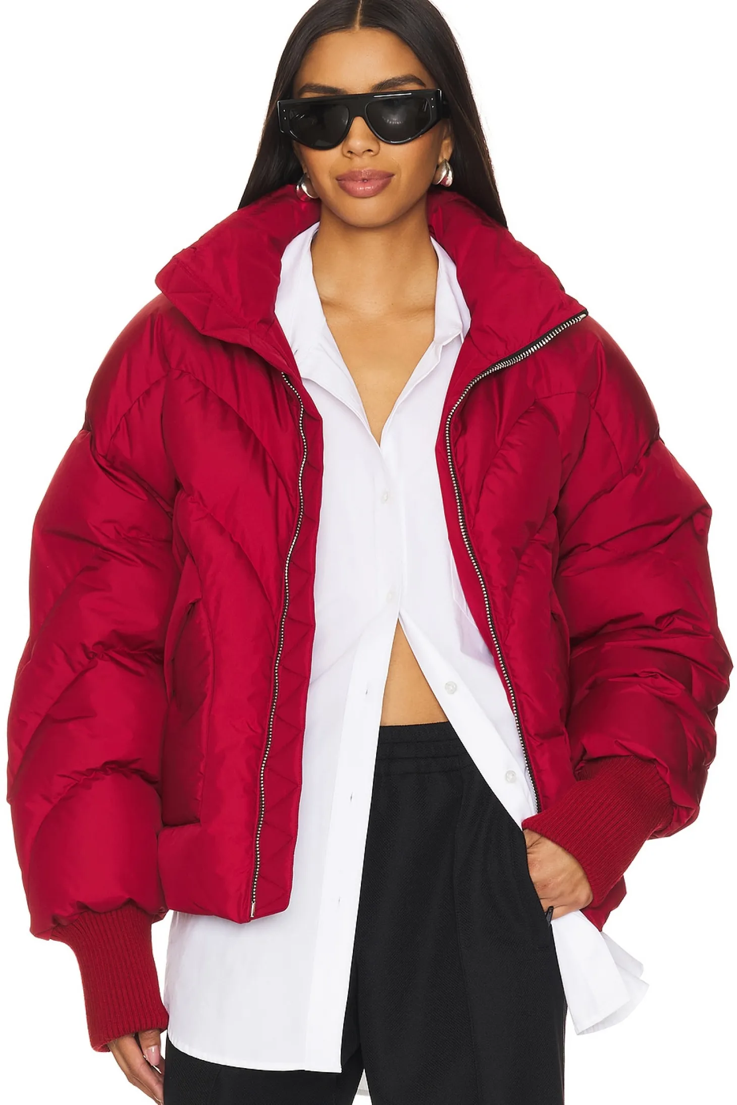 Self & Lining: 100% polyester Ribbing: 44% wool 44% wool 10% polyamide 2% elastane Padding: 80% down 20% white duck feathers.Made in Italy.Machine wash.Front zip closure.Front heart snap pockets Elasticized ribbed cuffs.Heavyweight ripstop fabric