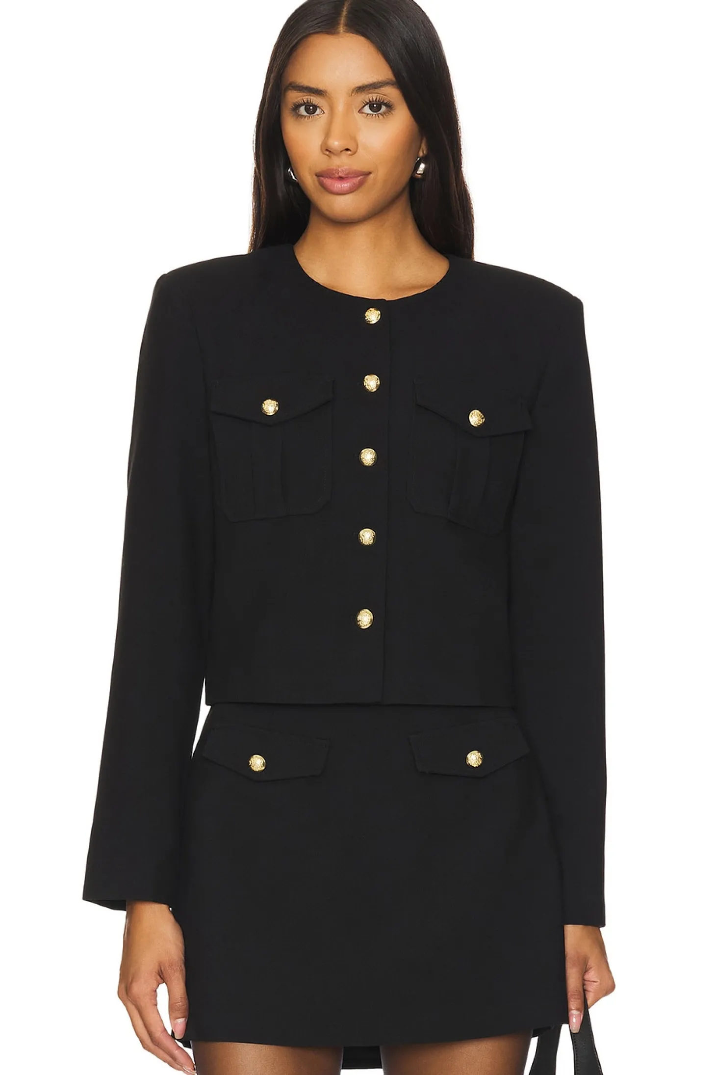 Self: 77% polyester 19% rayon 4% spandex Lining: 100% polyester.Made in China.Machine wash.Front button closure.Padded shoulders.Breast button pockets.Crepe fabric