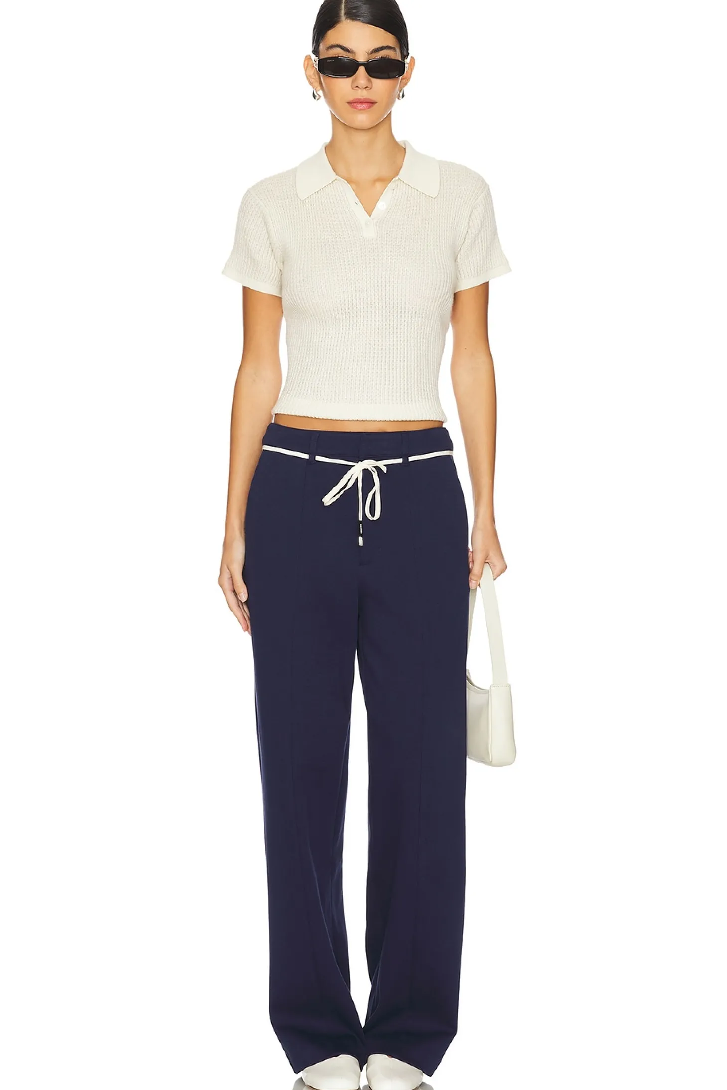 Self: 78% cotton 22% polyester Lining: 100% cotton.Made in China.Machine wash.Fly zip with hook and bar closure.Side seam pockets and back welt pockets.Optional and adjustable drawstring tie Heavyweight knit fabric.20" at the knee narrows to 18" at the leg opening
