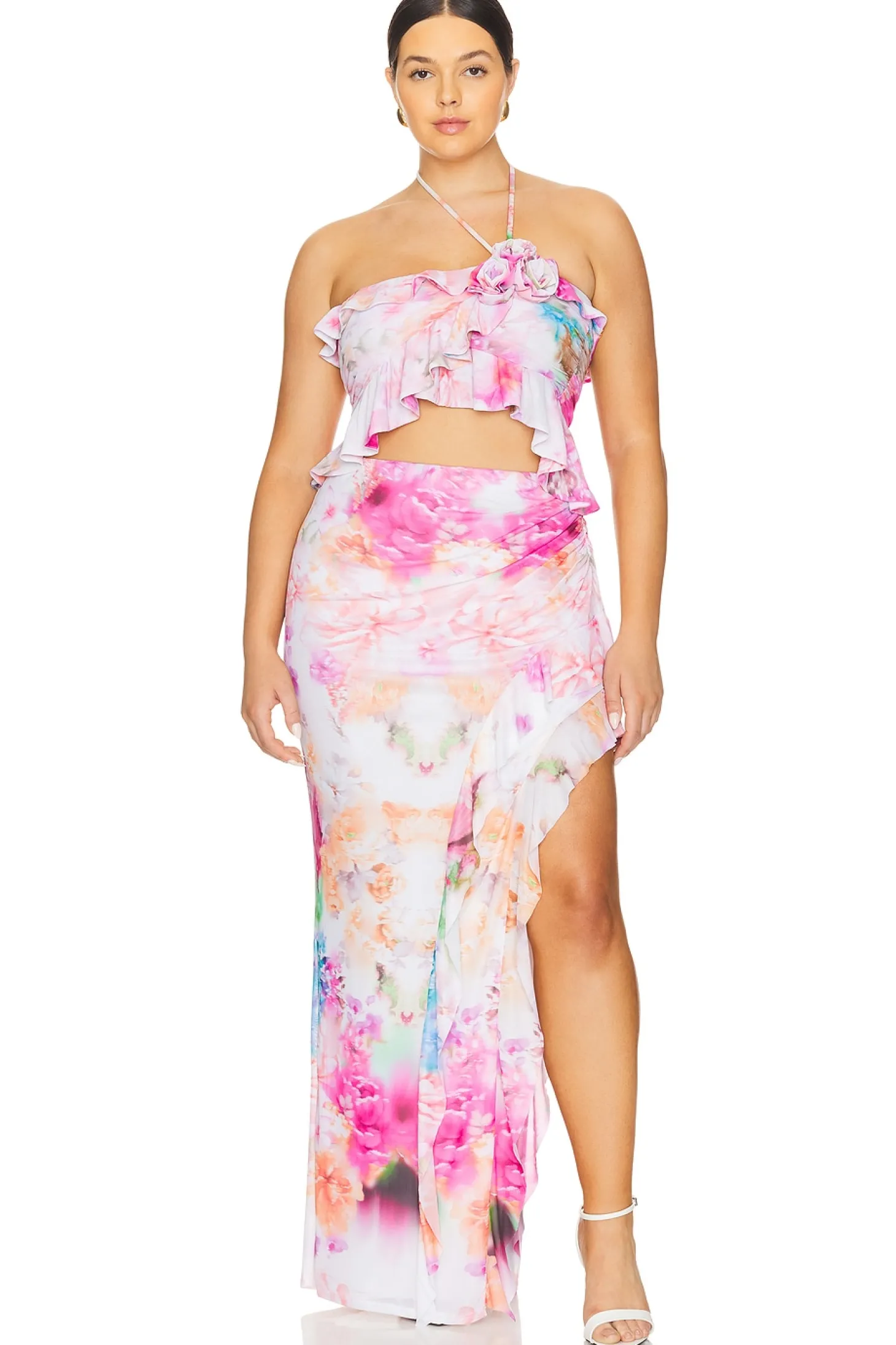 Self: 95% polyester 5% spandex Lining: 95% polyester 5% spandex.Made in China.Machine wash.Pull-on styling with elastic neckline.Halter neck tie closure.Item not sold as set.Mesh fabric with ruched sides and florette accent