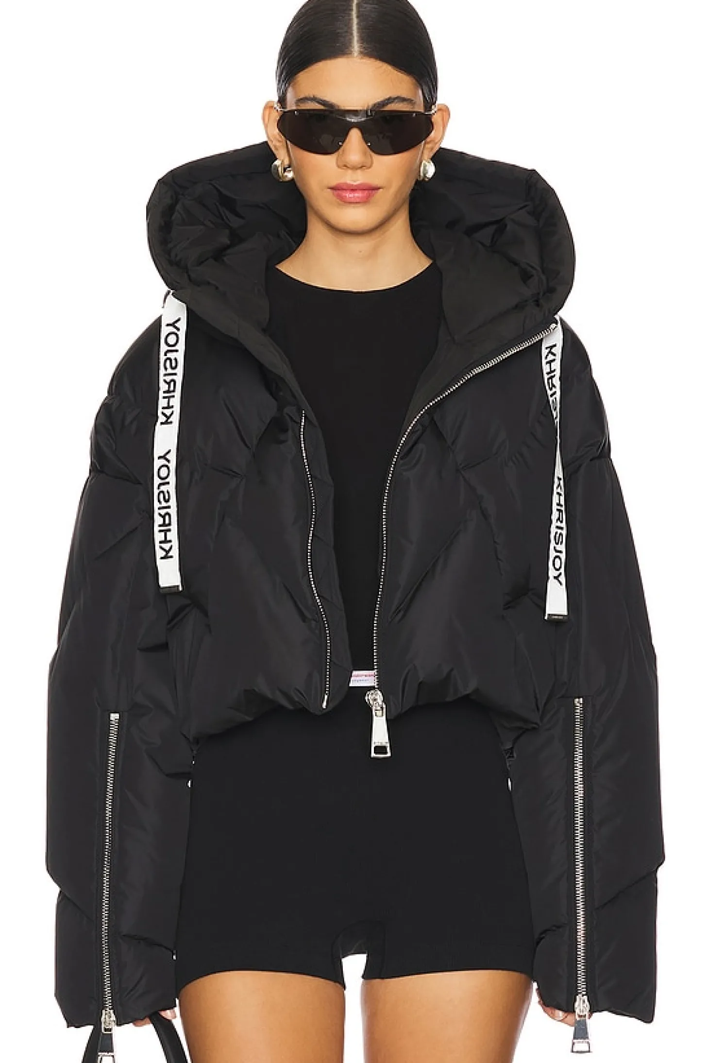 Self: 100% polyester Lining 1: 100% polyester Lining 2: 100% polyester Padding: 80% down 20% feathers.Made in Italy.Hand wash.Exposed front zipper closure.Side pockets.Drawstring hoodie with unique Khrisjoy drawstring.Zip cuffs.Padded ripstop fabric