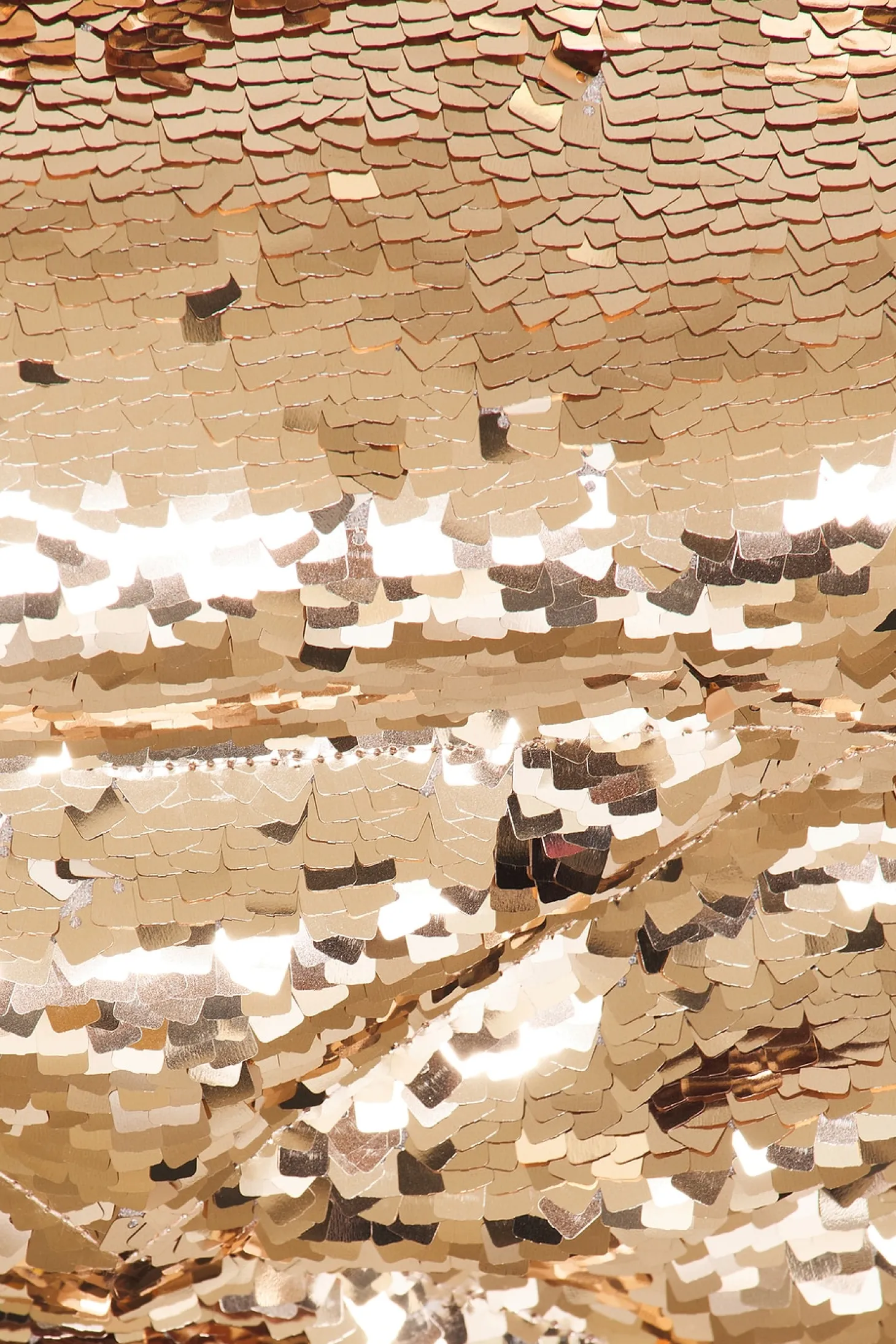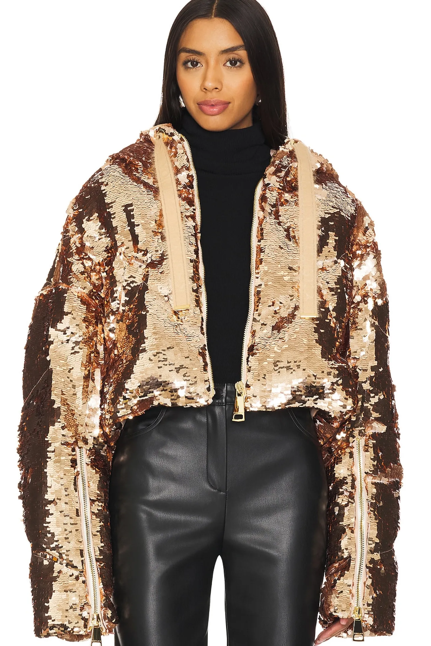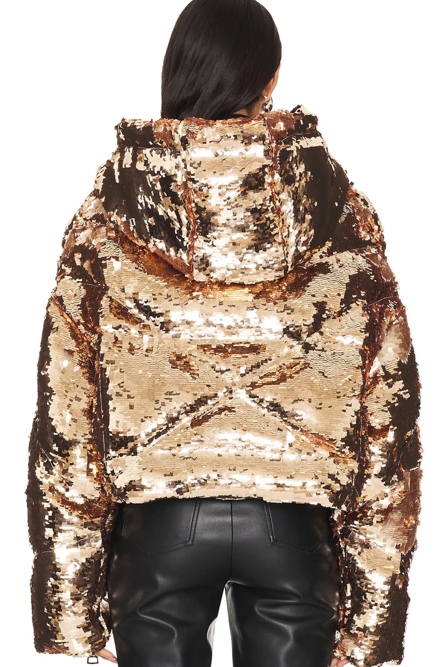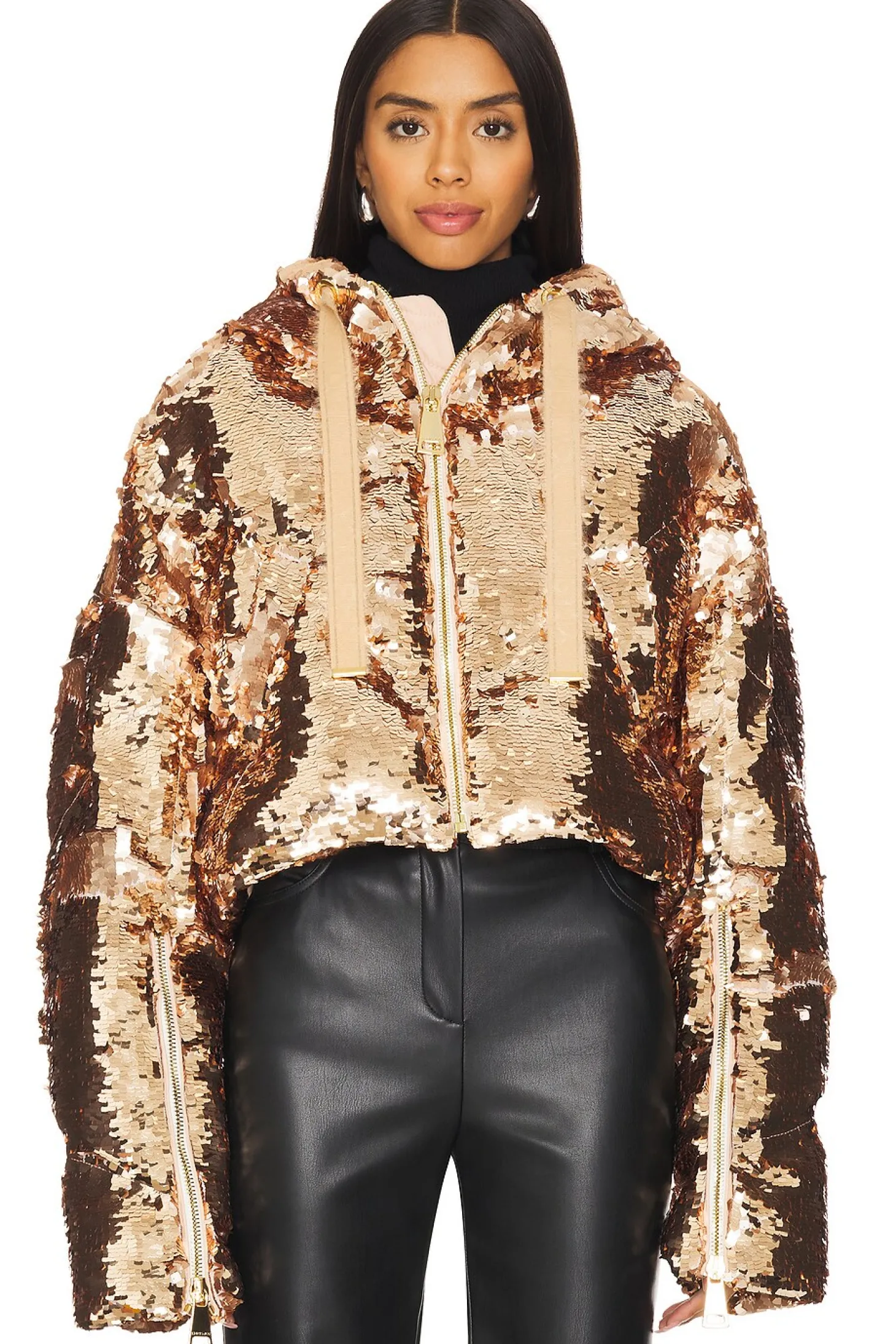 Self: 100% polyester Lining: 100% polyester Padding: 80% down 20% feathers.Made in Italy.Hand wash.Exposed front zipper closure.Side pockets.Hoodie with unique Khrisjoy drawstrings.Zip sleeves.Sequin embellished ripstop fabric with pull-cord waistband