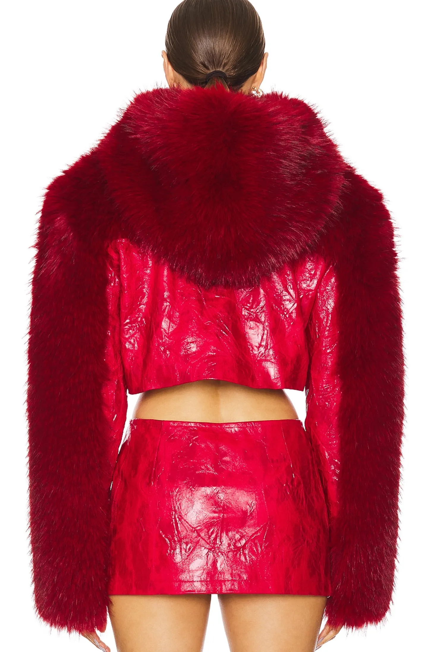 Self: 100% rayon Lining: 100% polyester.Made in China.Dry clean only.Front zip closure.Attached hood.Heavyweight faux leather fabric with faux fur trim