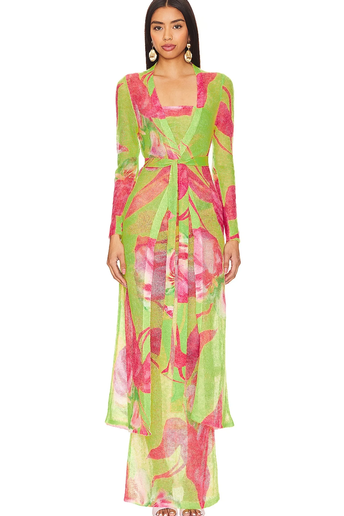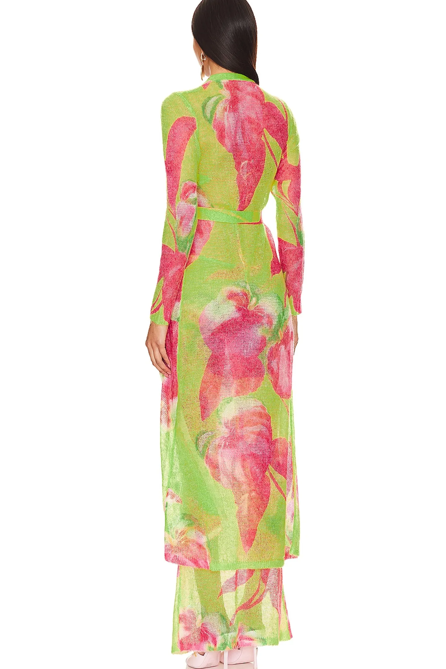 30% mohair 30% acrylic 25% wool 15% mohair.Made in China.Hand wash.Open front with detachable waist tie closure.Lightweight open knit fabric.Item not sold as a set