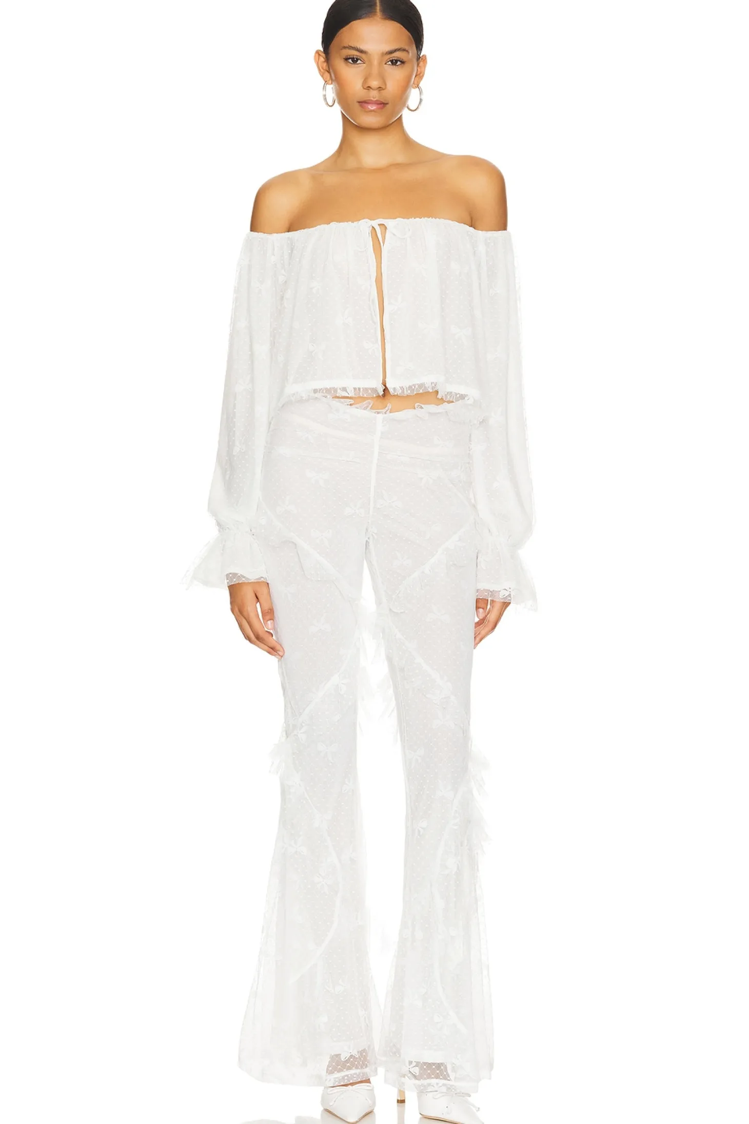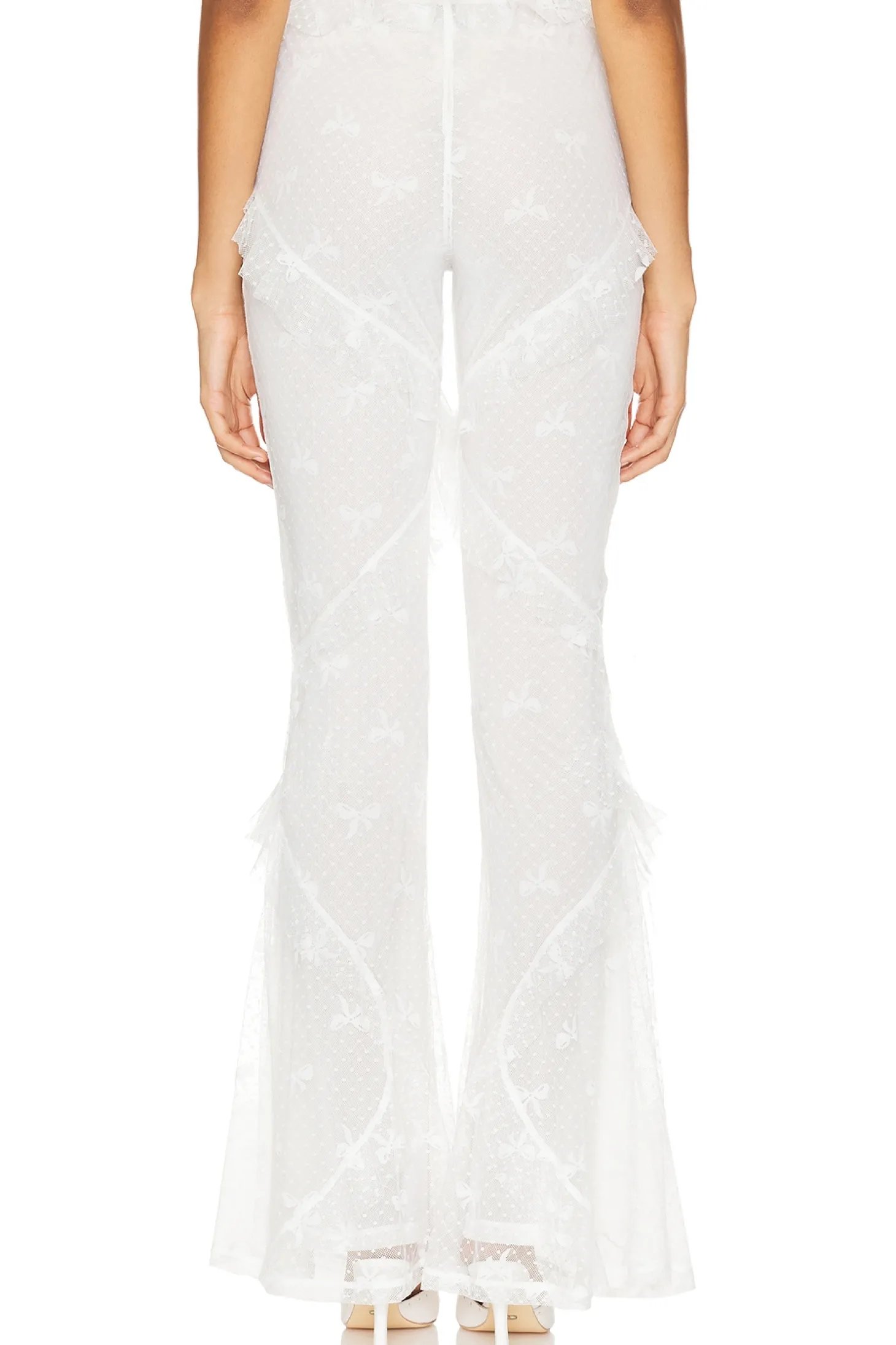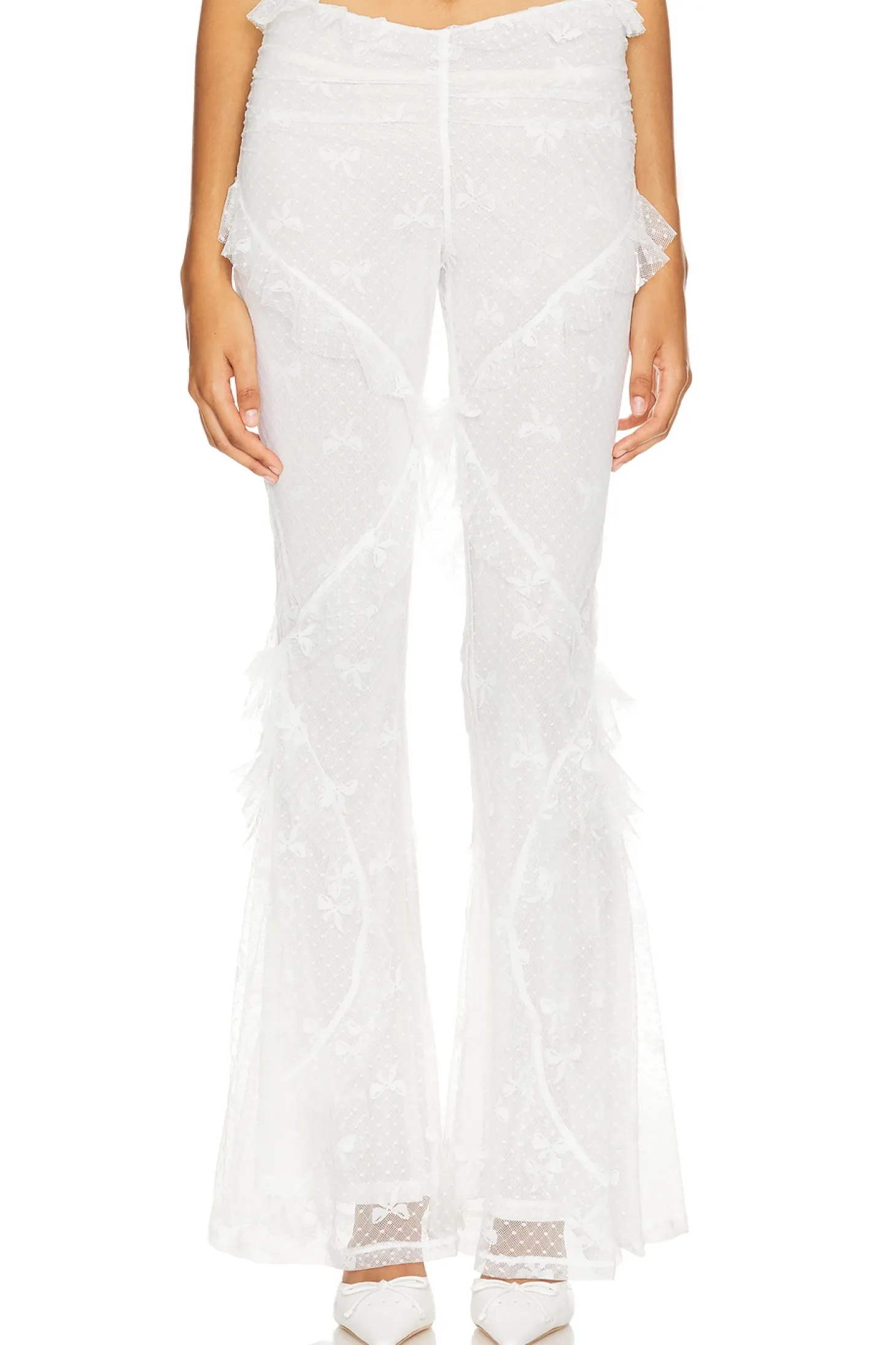 Self: 92% nylon 8% elastane Lining: 94% polyester 6% elastane.Made in China.Hand wash.Elastic waistband.Swiss dot fabric with ruffled trim.14" at the knee breaks to 36" at the leg opening