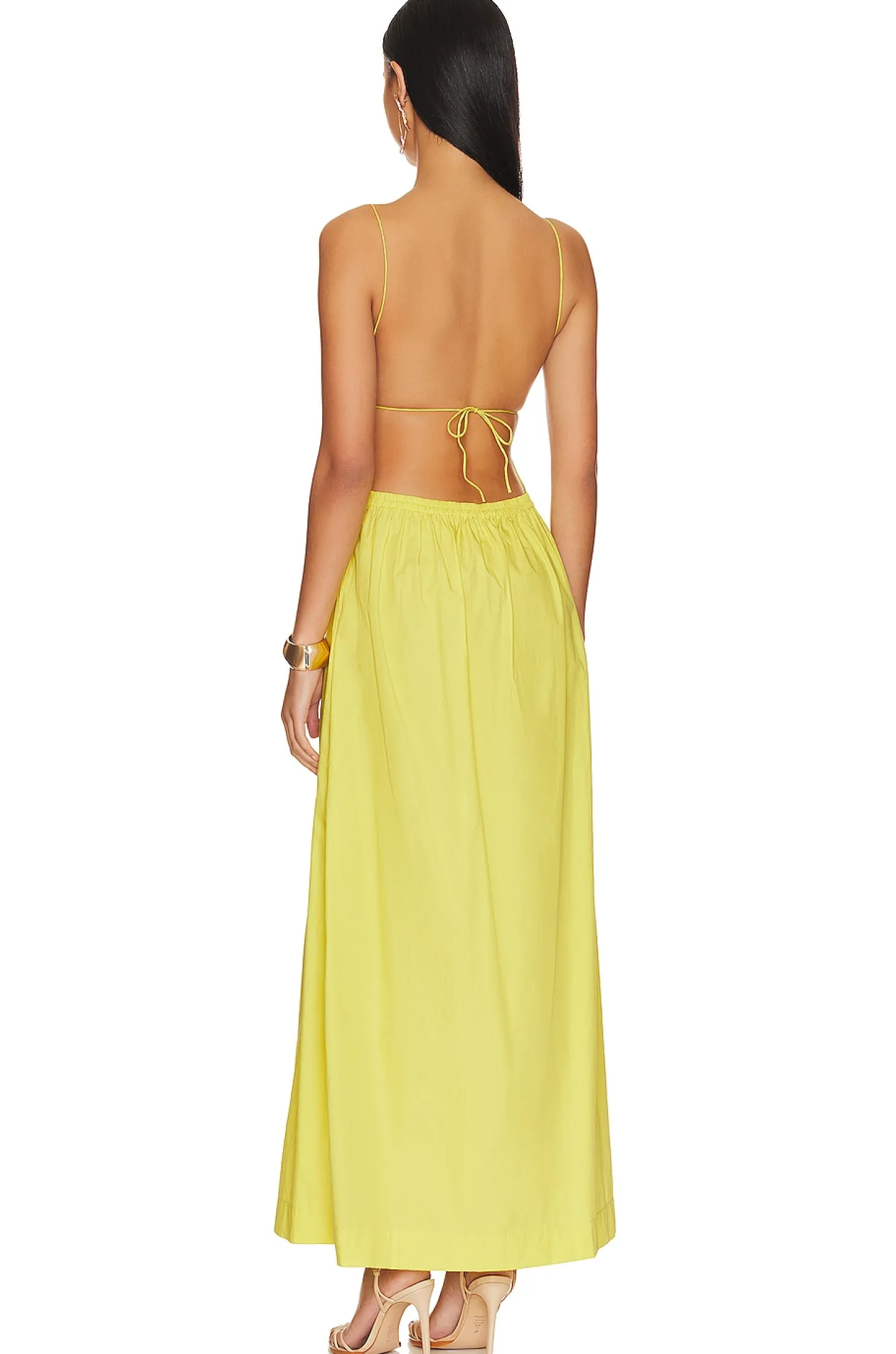 100% cotton.Made in Indenosia.Hand wash.Unlined.Pull-on styling with strappy back tie closure.Elastic back trim.Side seam pockets Crisp poplin fabric