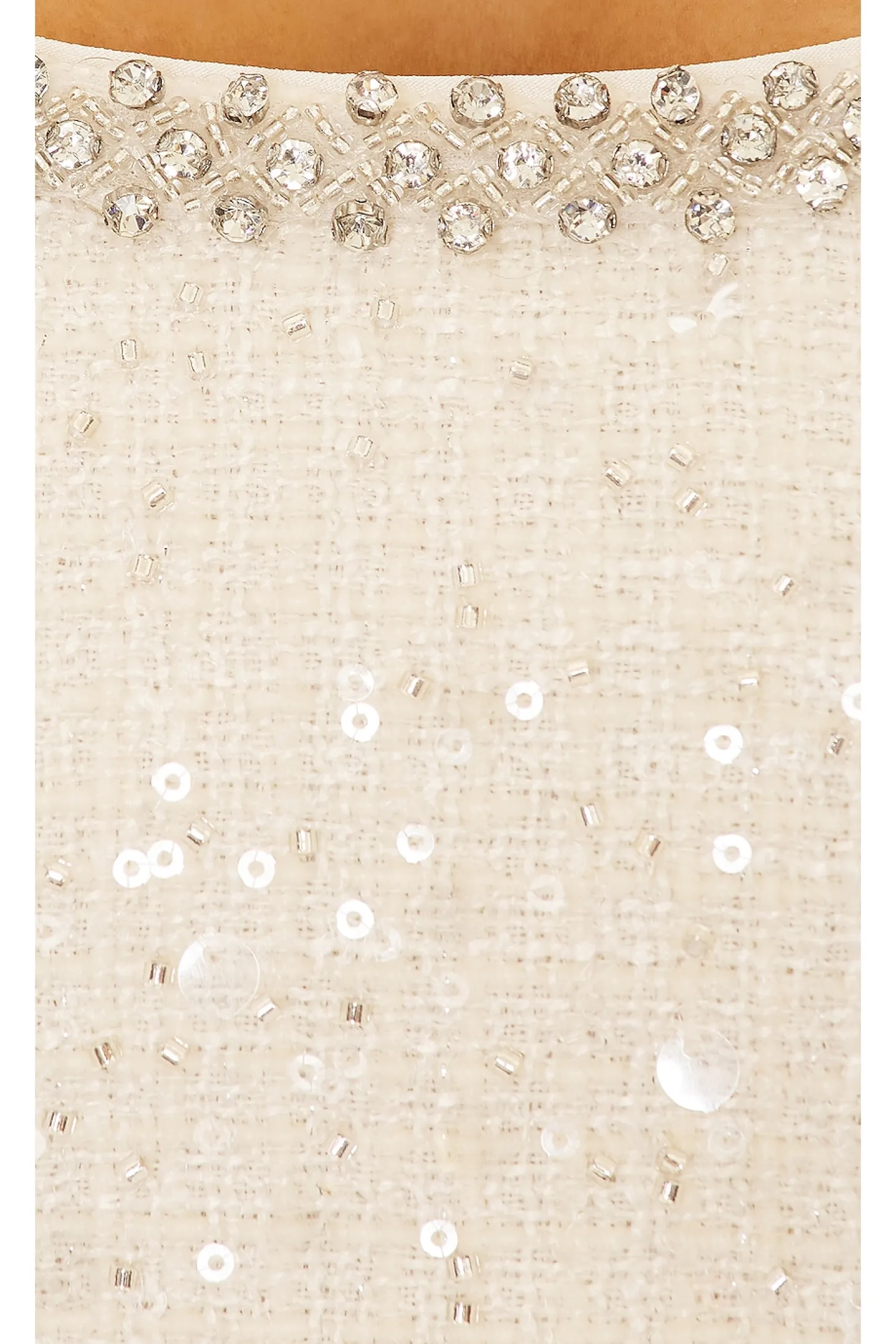 Self 1: 87% polyester 12% viscose 1% metallized fiber Self 2: 100% polyamide Lining: 100% polyester.Made in China.Dry clean only.Fully lined.Hidden back zipper closure.Crystal embellished neckline trim.Side cut-out with bow accents Midweight tweed fabric with tonal sequin and bead accents