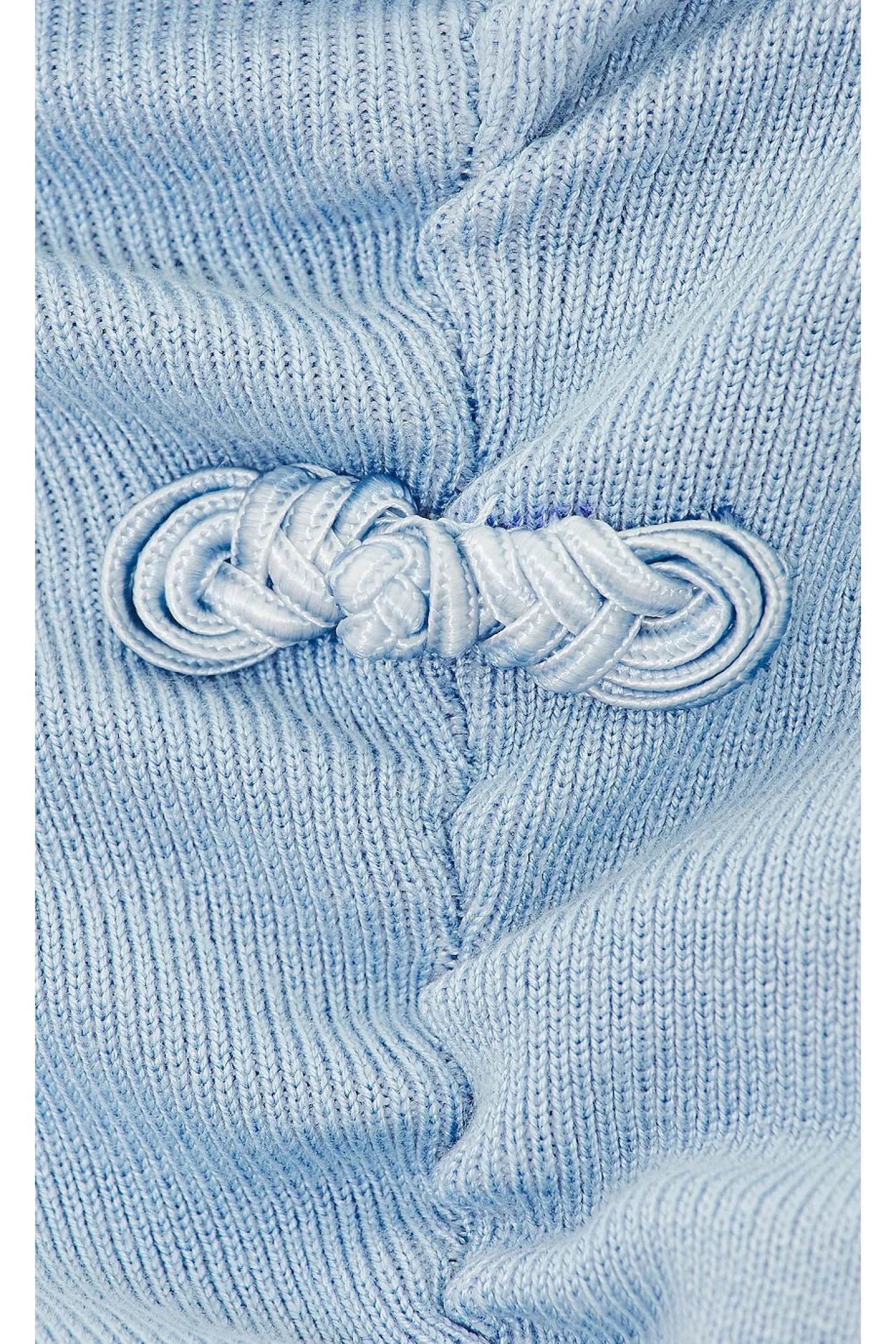 100% viscose.Made in China.Hand wash.Unlined.Pull-on styling.Asymmetric neckline.Frog knot accents at ruched side Midweight ribbed jersey fabric with side notched side
