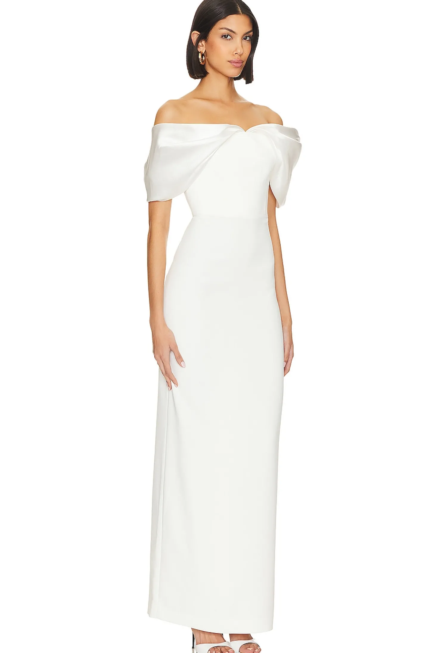Polyester blend.Imported.Dry clean recommended.Unlined.Hidden back zipper closure.Off the shoulder styling.Midweight crepe fabric with back vent.Neckline to hem measures approx 56" in length