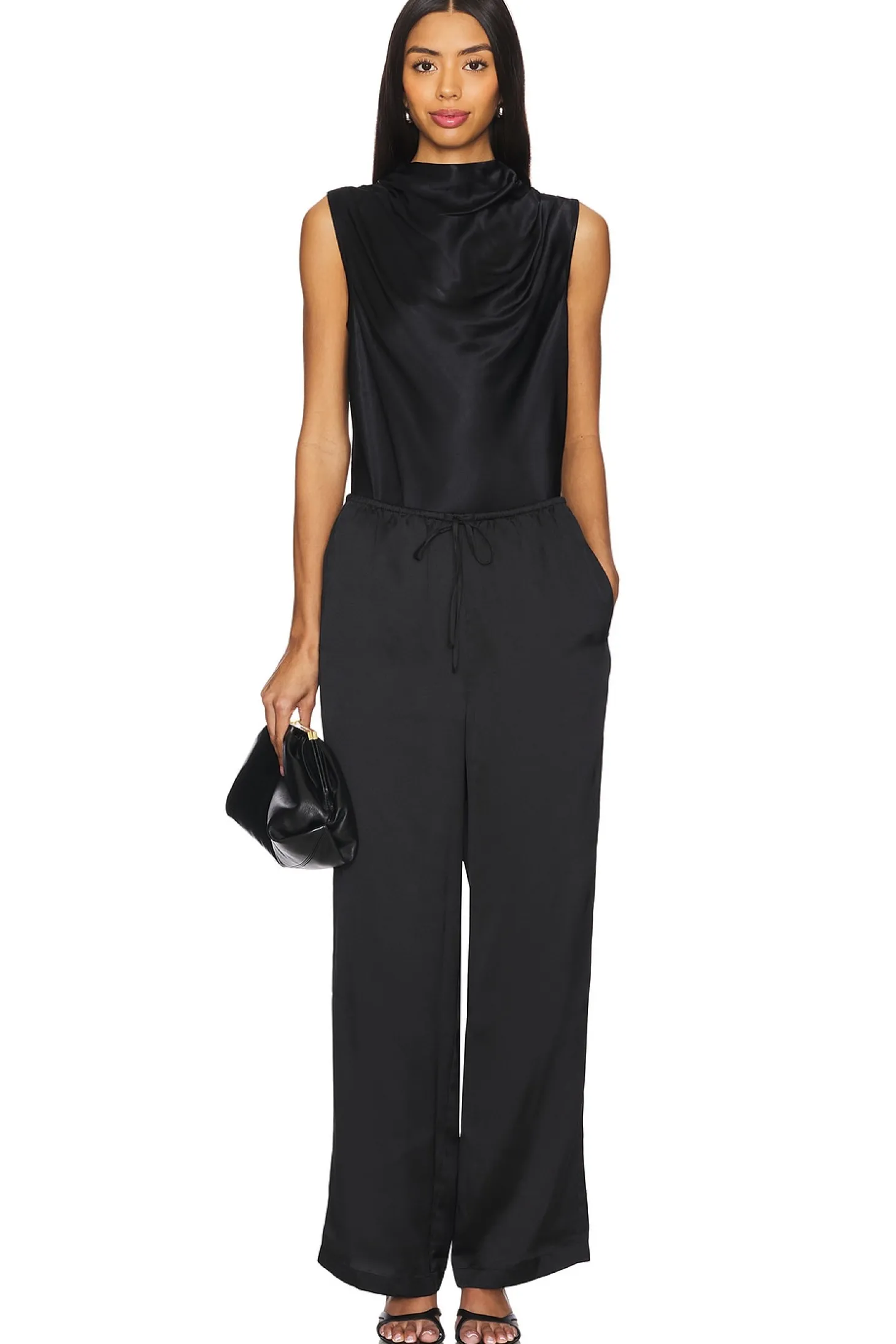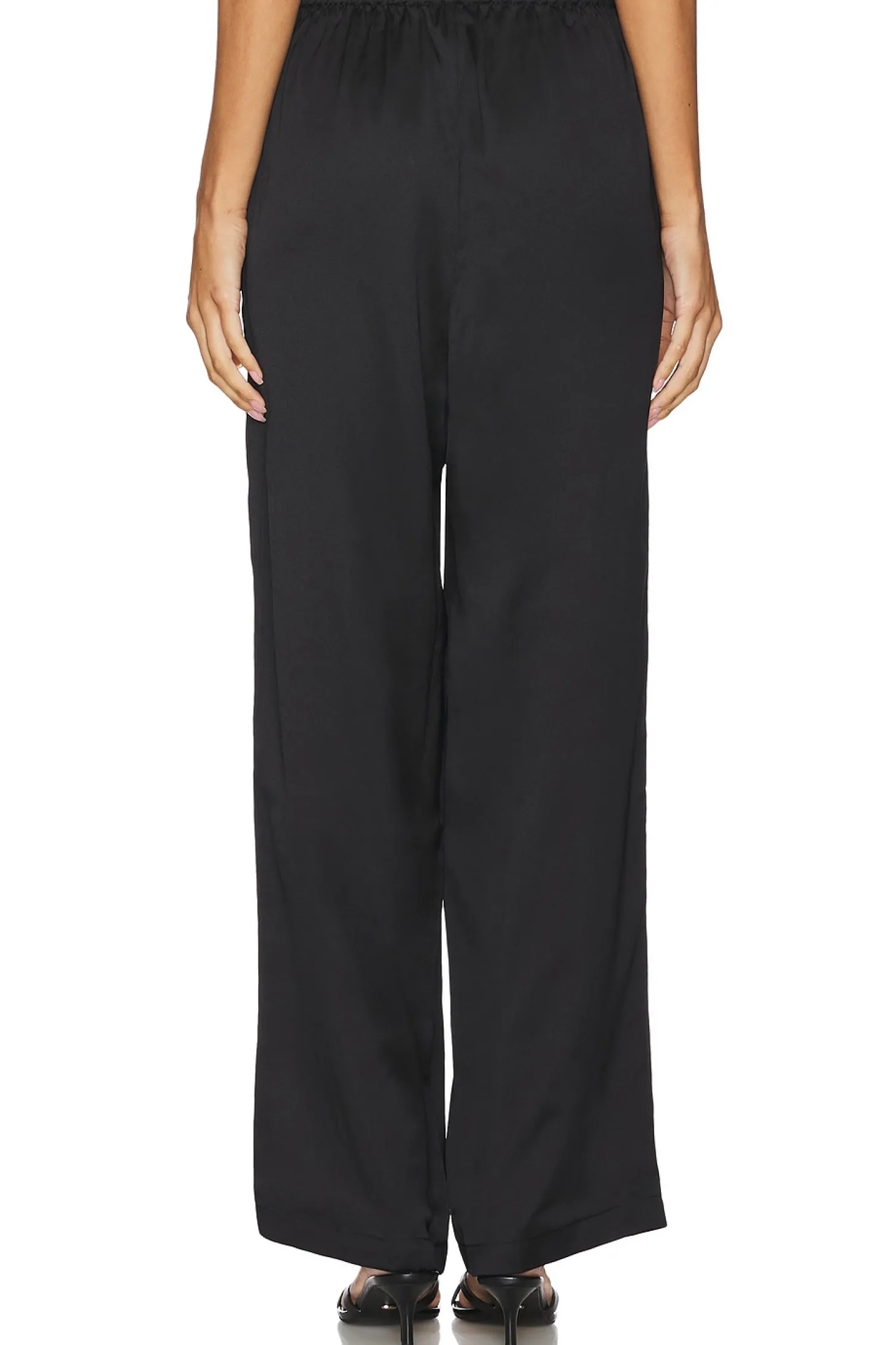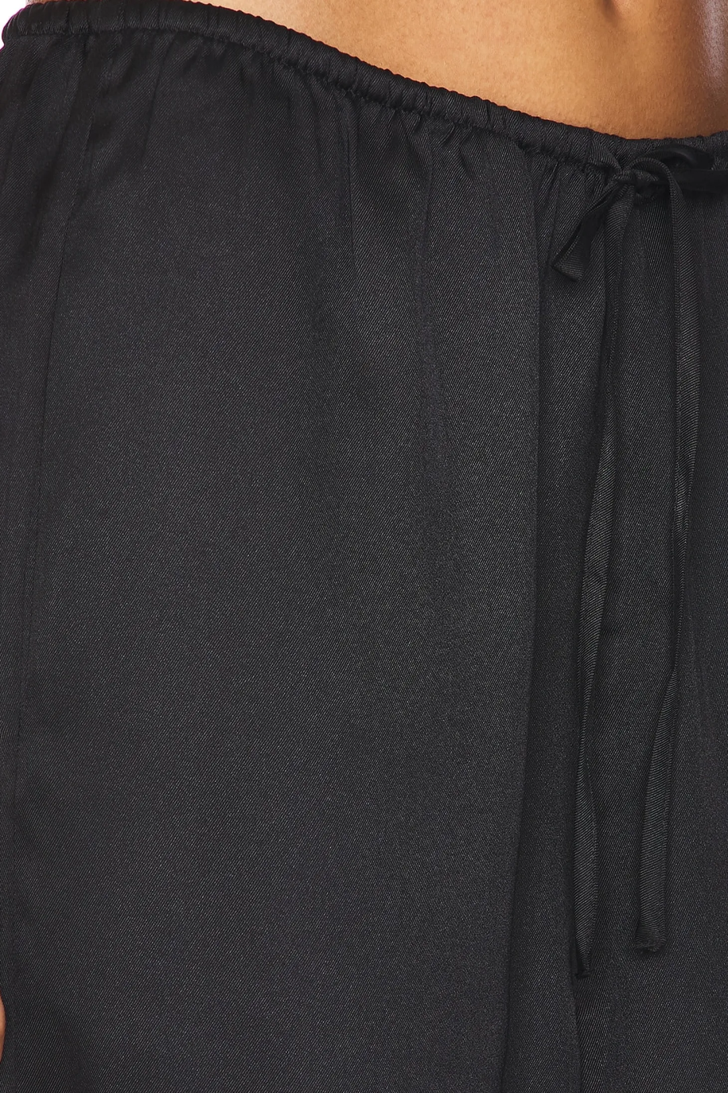 100% polyester.Made in China.Dry clean only.Front drawstring tie closure.Side seam pockets.Lightweight sateen fabric.20" at the knee narrows to 18" at the leg opening