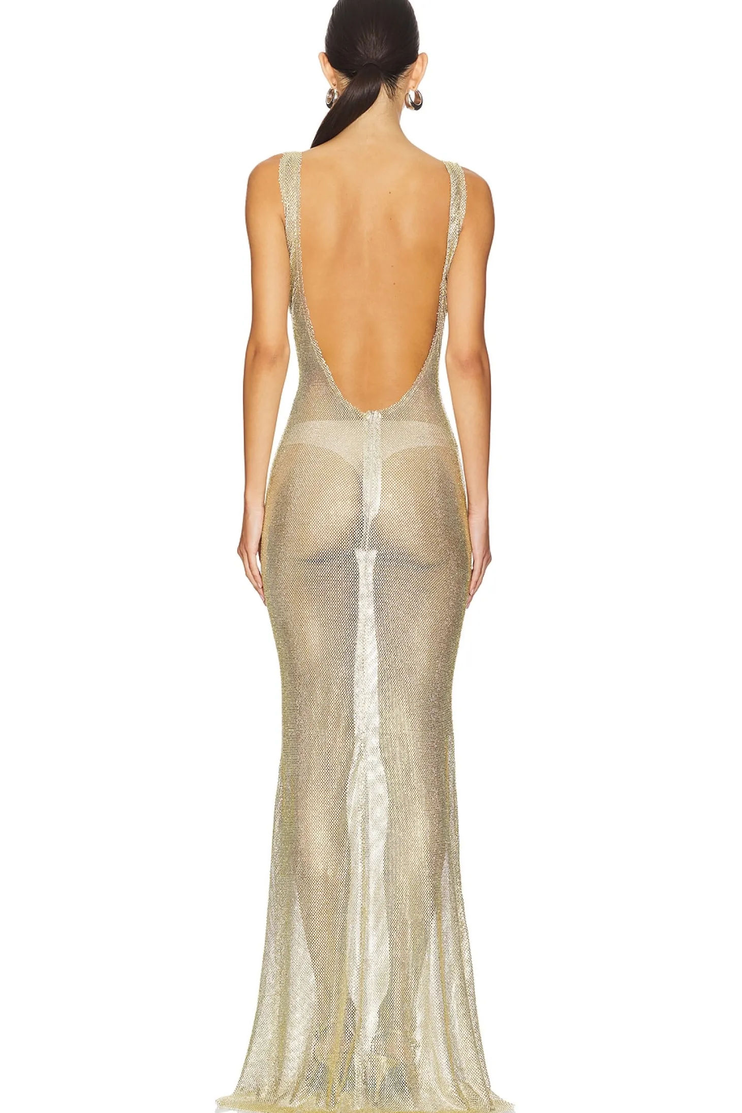 100% polyester.Made in Turkey.Dry clean only.Unlined.Hidden back zipper closure.Crystal chainmail design.Garment is intentionally sheer, undergarments will show through. Please note undergarment not included
