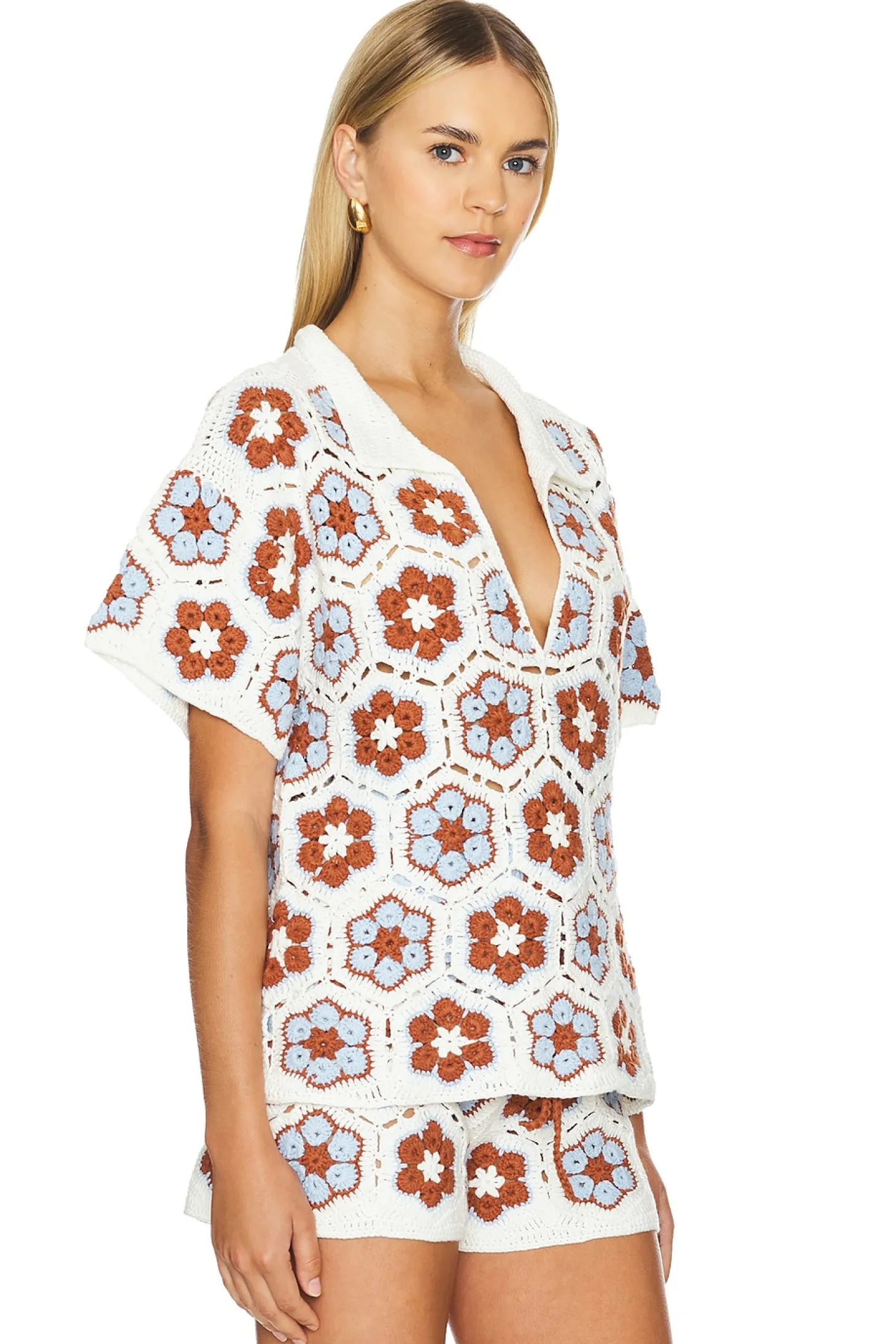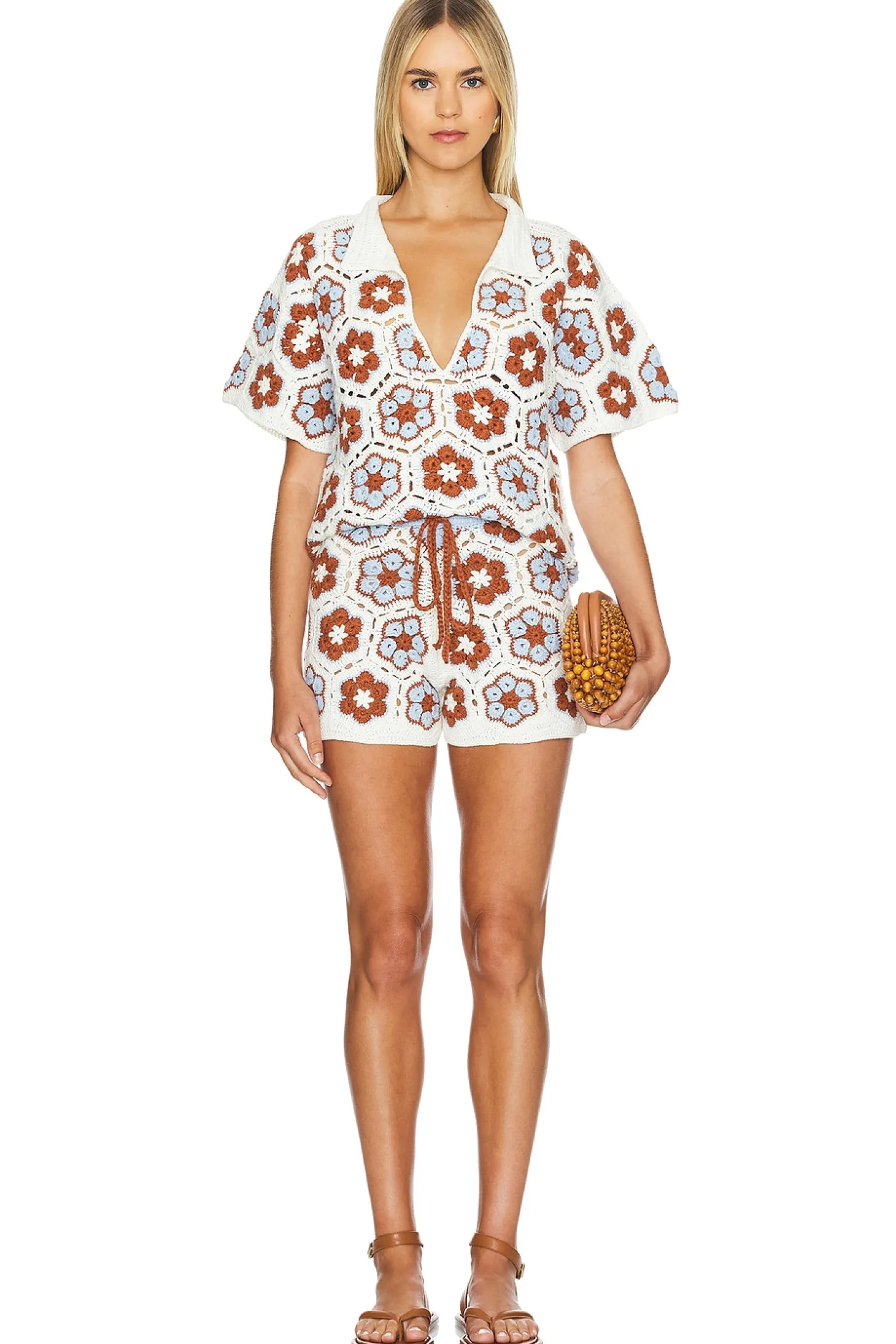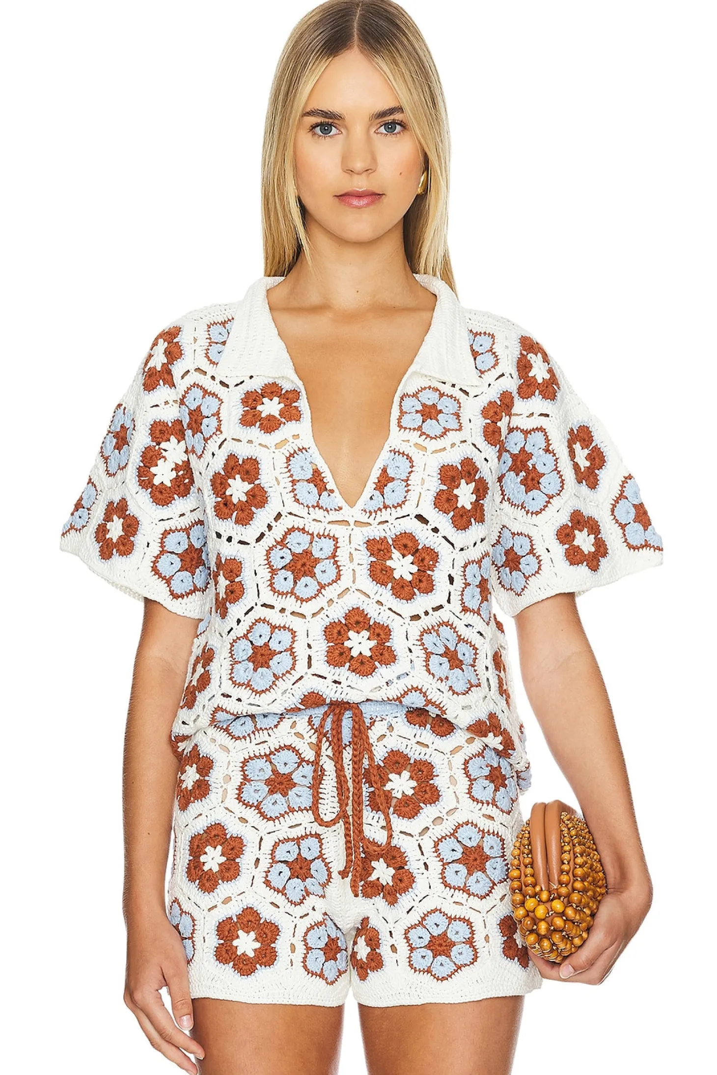60% cotton 40% acrylic.Made in China.Hand wash.Knit crochet fabric.Garment is made with a semi-sheer fabric, undergarments can show through