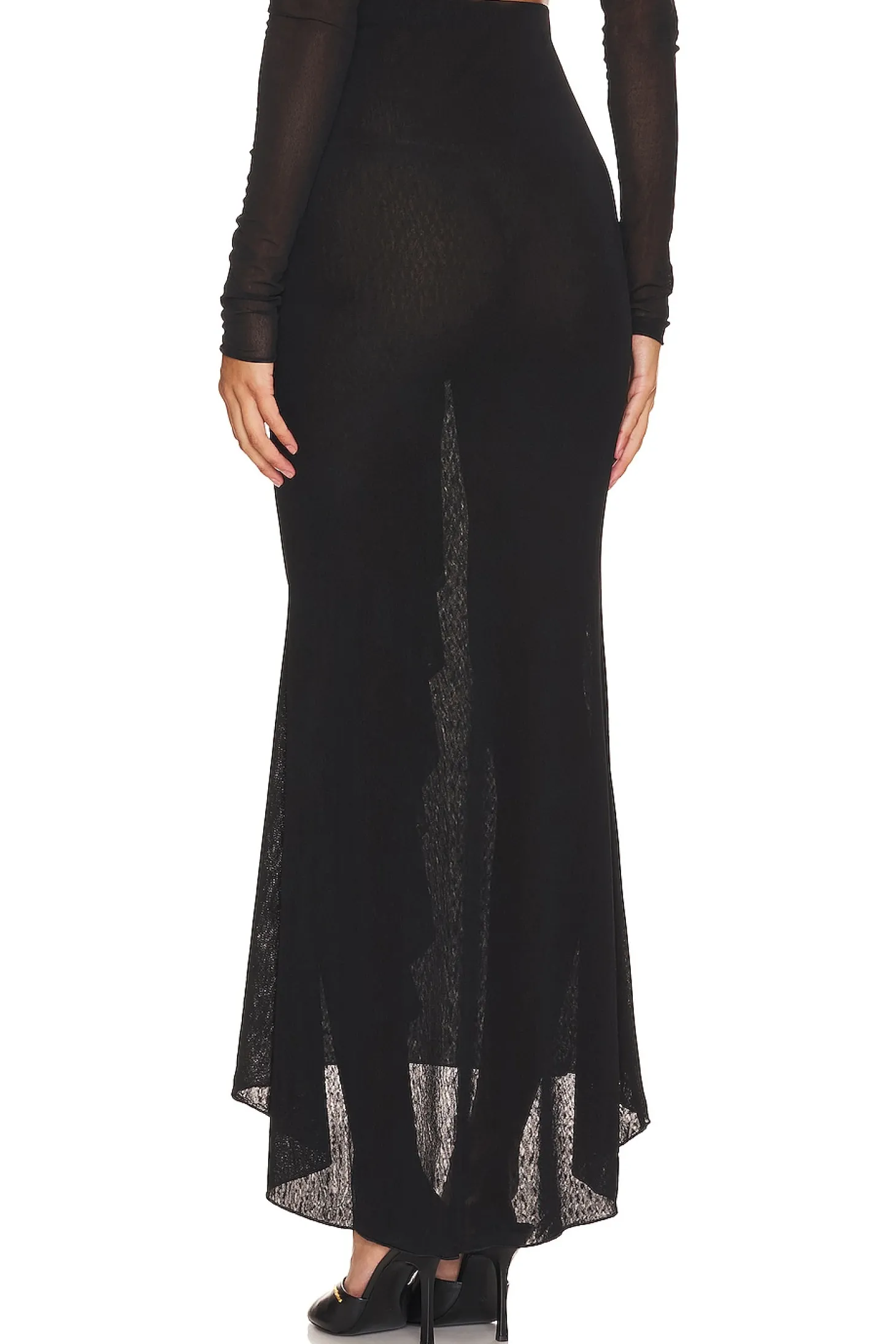 Elevate your evening with NBD's Deepa Maxi Skirt in Black. This flowy mesh skirt includes a hidden back zipper closure and a chic ruffle detail at the front. Perfect for a night out, it adds a touch of elegance to any occasion..95% polyester 5% elastane.Made in China.Hand wash.Fully lined.Elastic waistband.Mesh fabric with ruffle trim Item not sold as a set Garment is made with a semi-sheer fabric, undergarments can show through.Skirt measures approx 47.5" in length