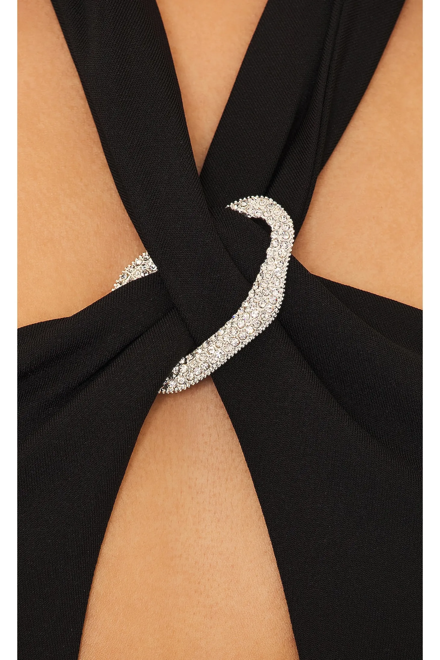 95% polyester 5% elastane.Made in China.Hand wash.Hidden side zipper closure.Halterneck tie closure.Bust cut-out with silver-tone crystal embellished charm.Attached draped tie accent at waist Jersey fabric