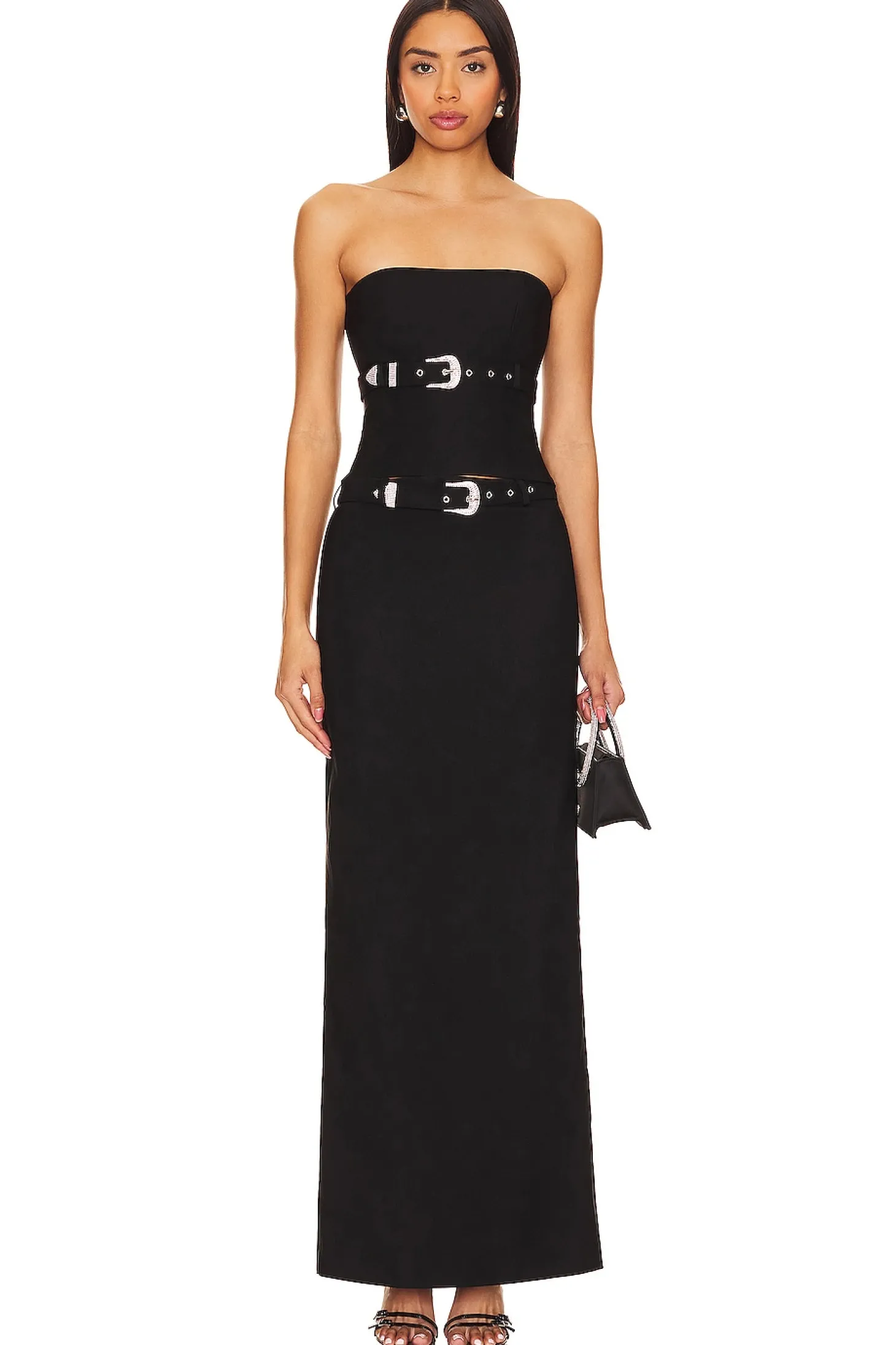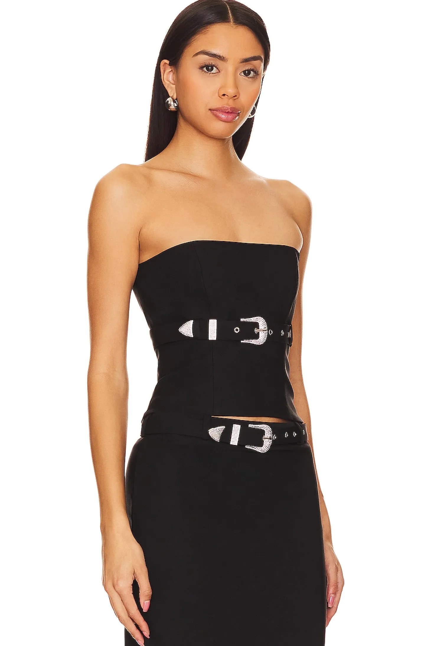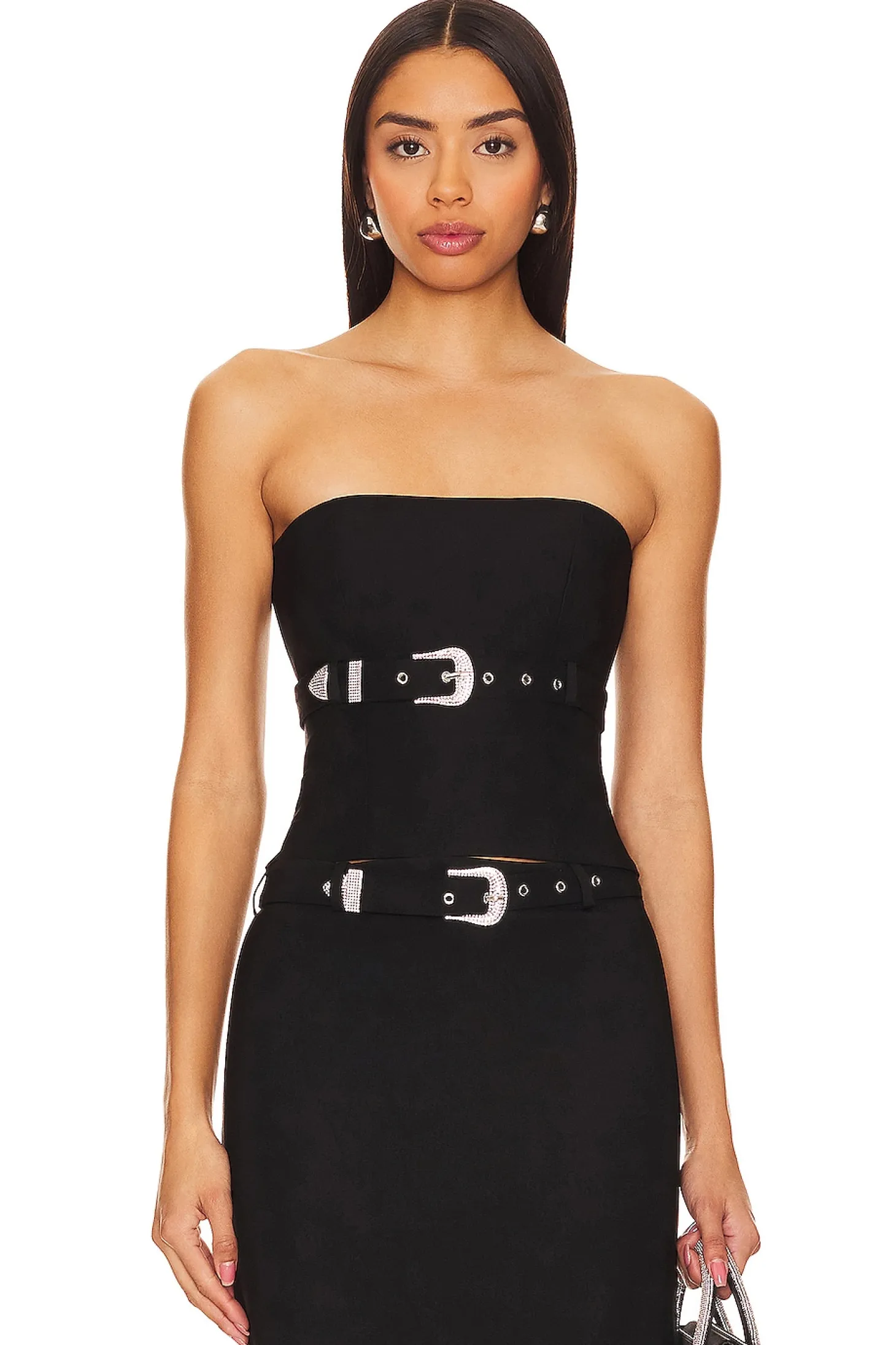 Meet the Dev Top by NBD – where innovation meets style in the sleek shade of Black. Unveil your edgy side with the exposed back zipper closure, a daring touch that sets you apart. The Dev Top comes with a detachable belt featuring a dazzling crystal-embellished buckle, adding a touch of glamour to your creative ensemble..63% rayon 33% nylon 4% elastane.Made in China.Dry clean only.Exposed back zipper closure.Boned bust.Subtle stretch bengaline fabric with detachable waist belt with silver-tone crystal embellished buckle closure.Item not sold as a set