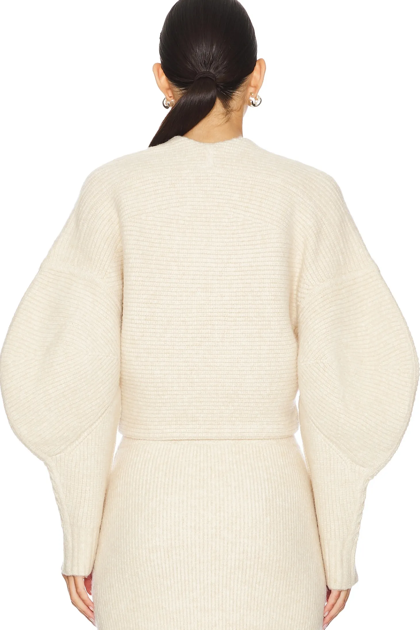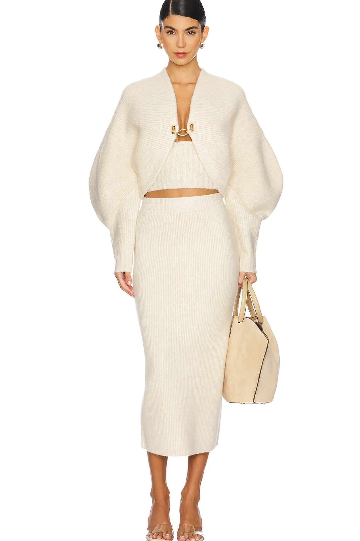 68% acrylic 12% polyester 11% nylon 6% wool 3% spandex.Made in China.Dry clean only.Open front with gold-tone hardware closure.Exaggerated sleeves.Heavyweight ribbed knit fabric Item not sold as set