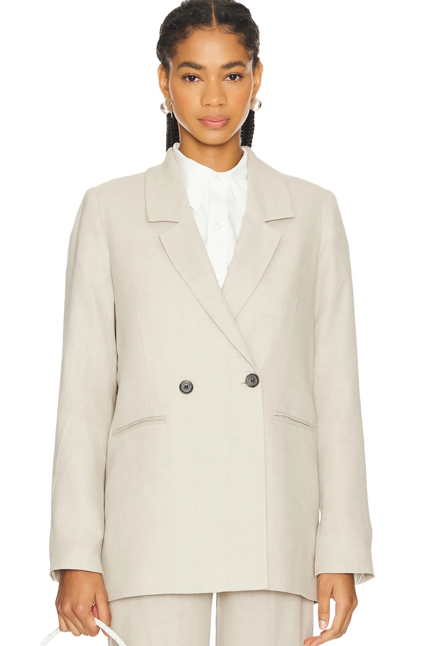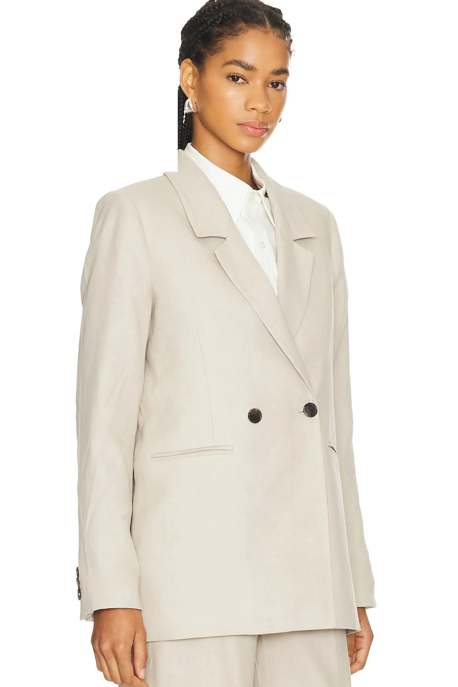 54% linen 45% viscose 1% spandex.Made in Turkey.Dry clean only.Front button closure.Front and inner breast pockets.Buttoned cuffs.Shoulder pads.Item not sold as set