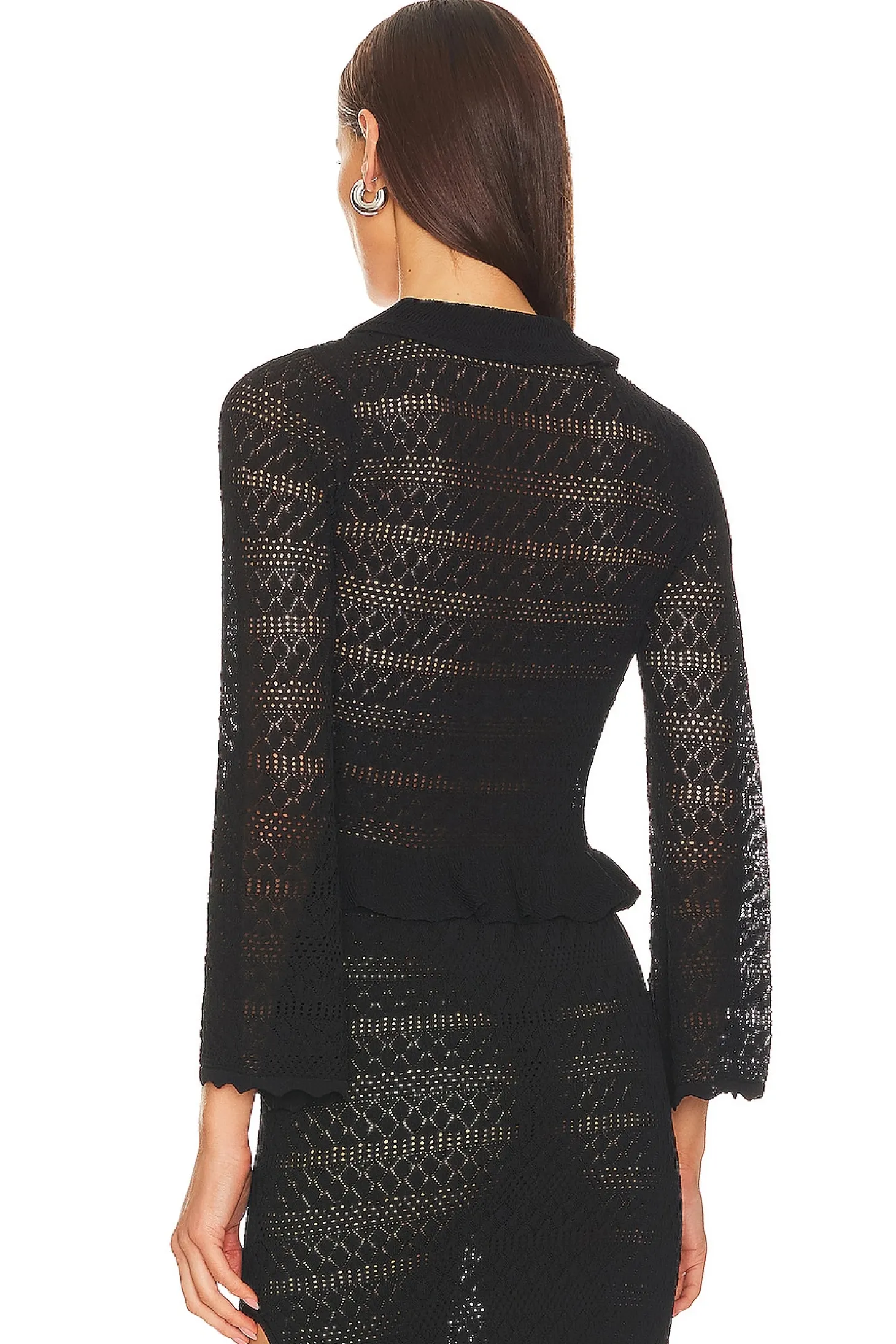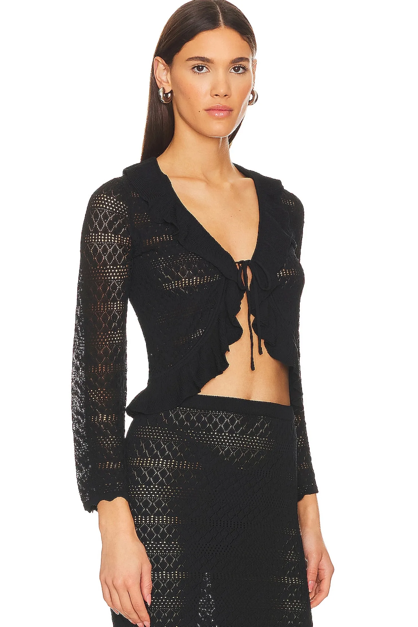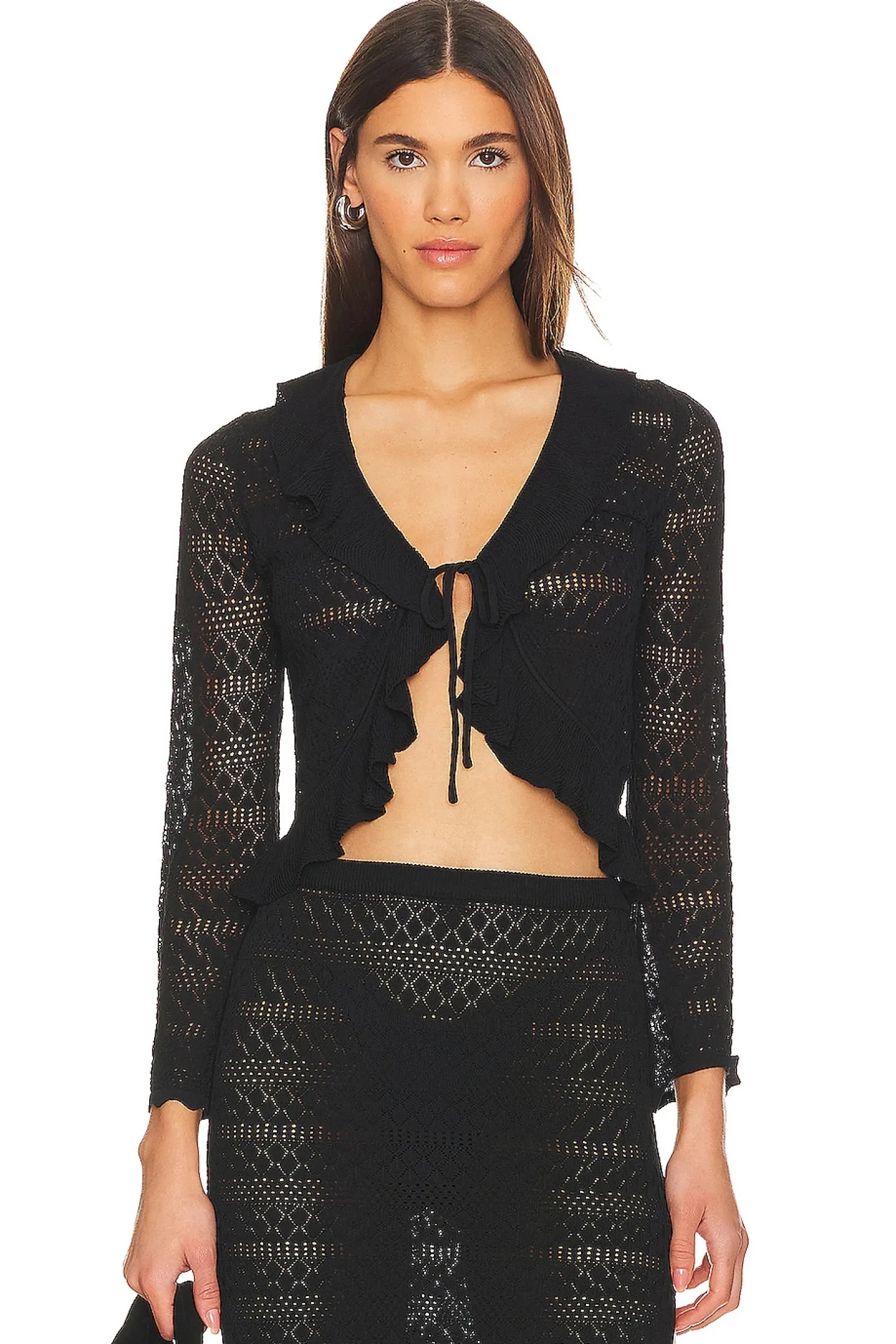 63% viscose 37% nylon.Made in China.Hand wash.Front tie closure.Ruffle neckline and hem.Crochet knit fabric.Item not sold as set