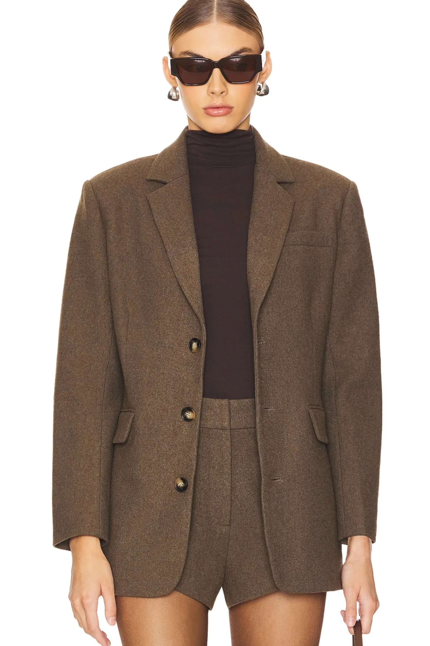 Self: 69% polyester 24% wool 6% rayon 1% spandex Lining: 100% polyester.Made in China.Dry clean recommended.Front button closure.Padded shoulders.Side tab pockets.Button cuffs.Tweed fabric Item not sold as set