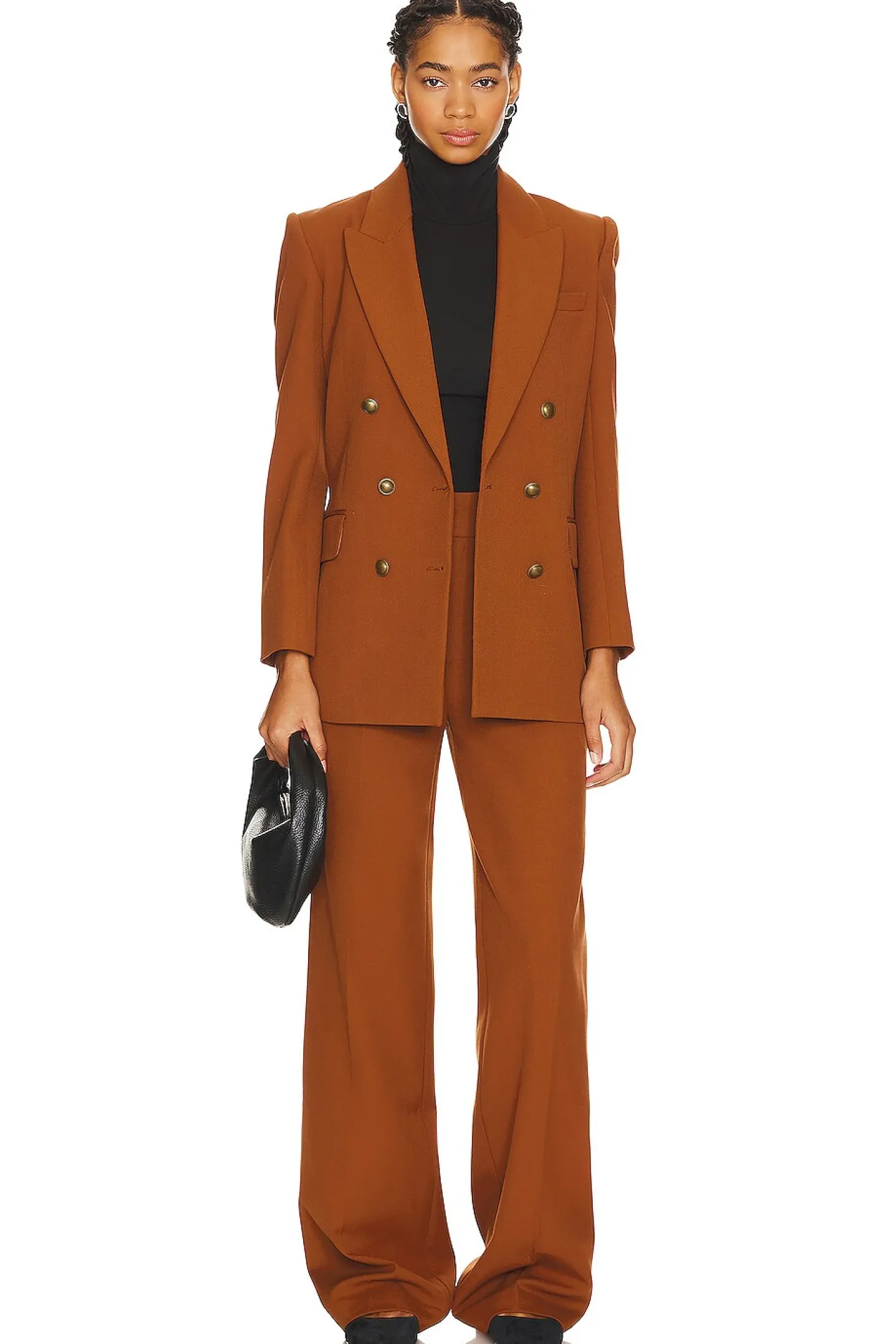 Self: 68% polyester 29% viscose 3% elastane Lining: 50% polyester 50% viscose.Made in Morocco.Dry clean only.Dual-breasted front button closure.Side flap pockets.Button cuffs.Twill suiting fabric