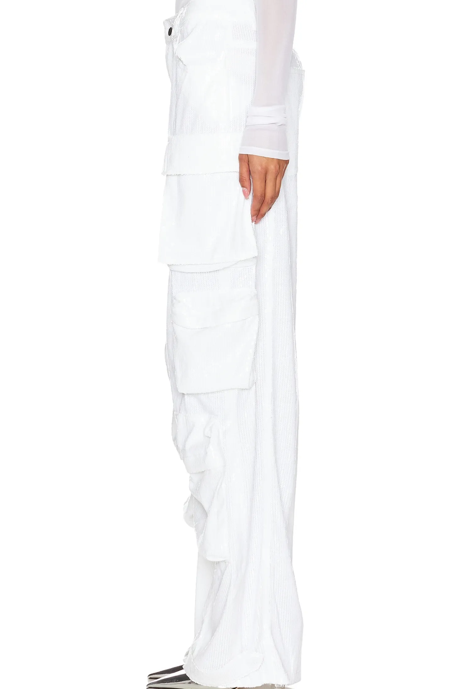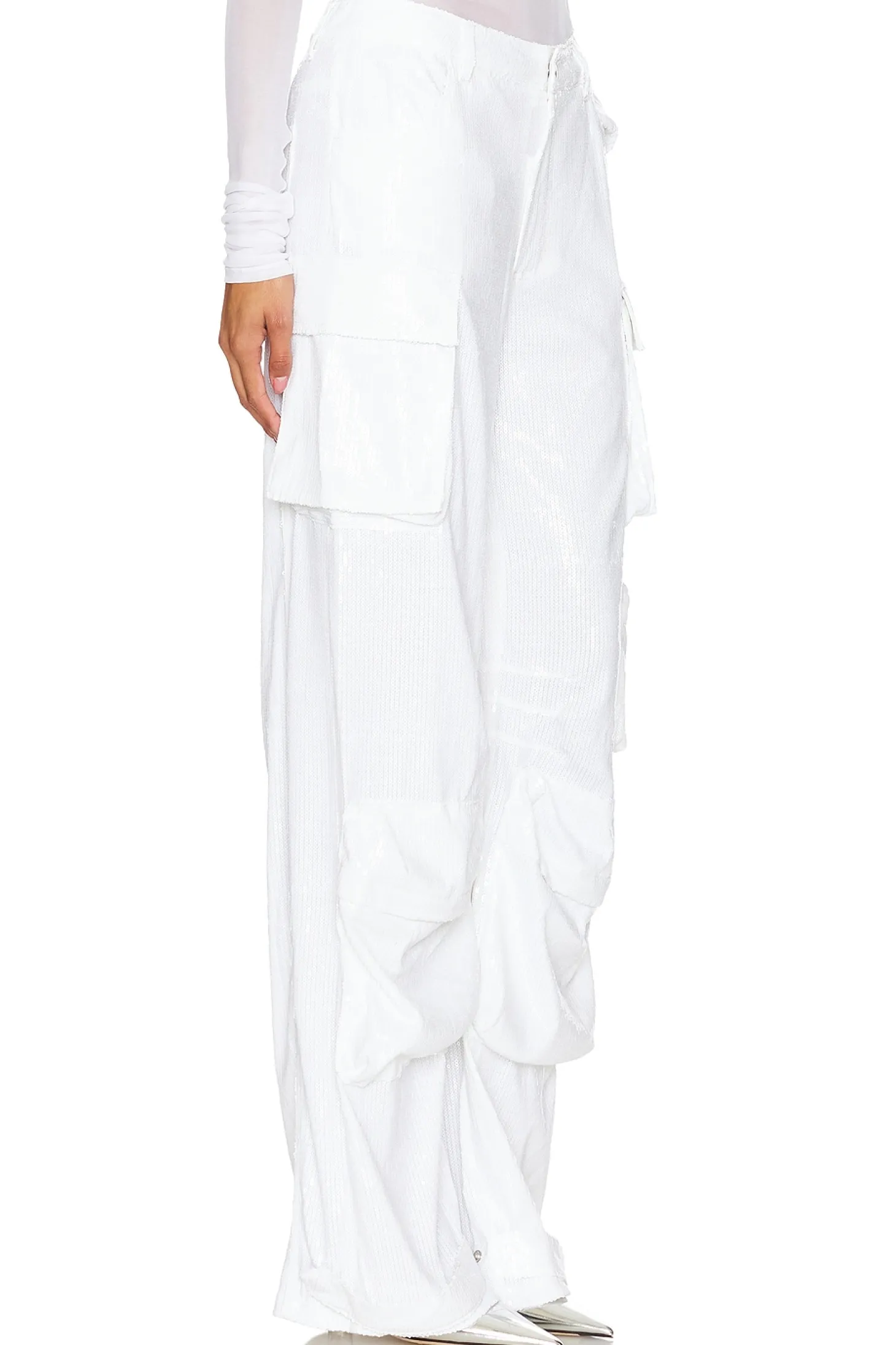 95% polyester 5% spandex.Made in China.Hand wash.Fly zip with button closure.4-pocket styling with 3 side snap button leg pockets.Sequin fabric with adjustable snap buttons at hem.22" at the knee narrows to 20" at the leg opening
