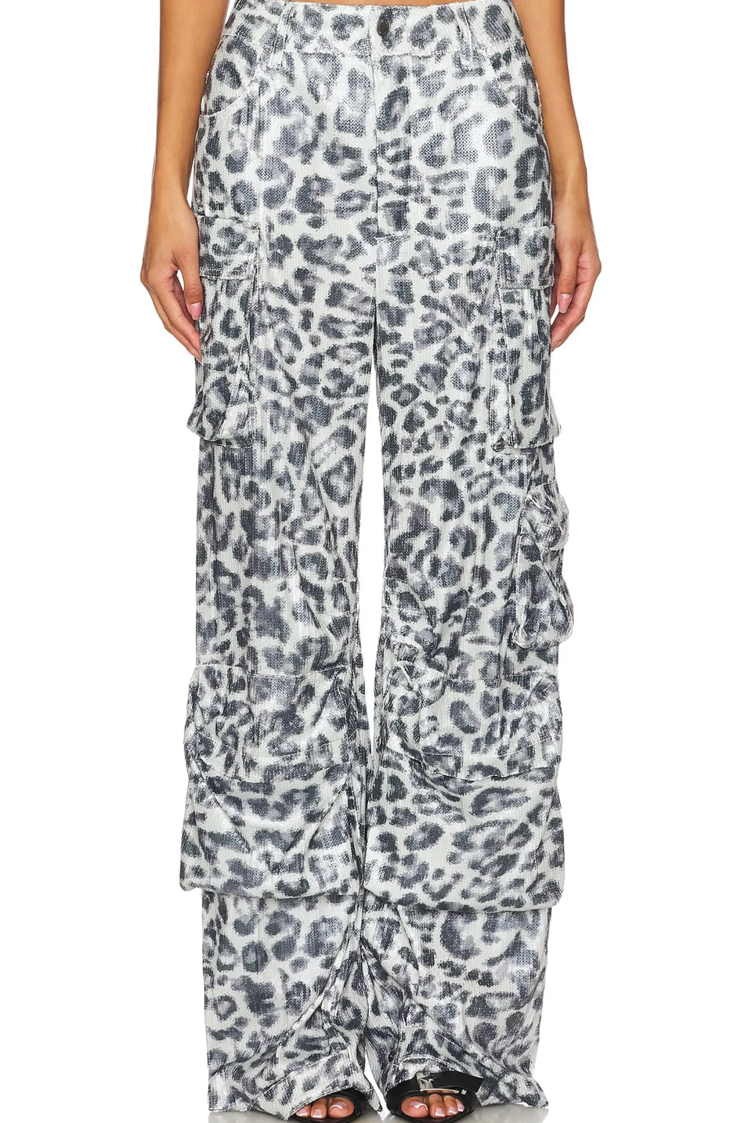 95% polyester 5% spandex.Made in China.Hand wash.Fly zip with button closure.4-pocket styling with 3 side snap button leg pockets.Sequin leopard fabric with adjustable snap buttons at hem.22" at the knee narrows to 20" at the leg opening