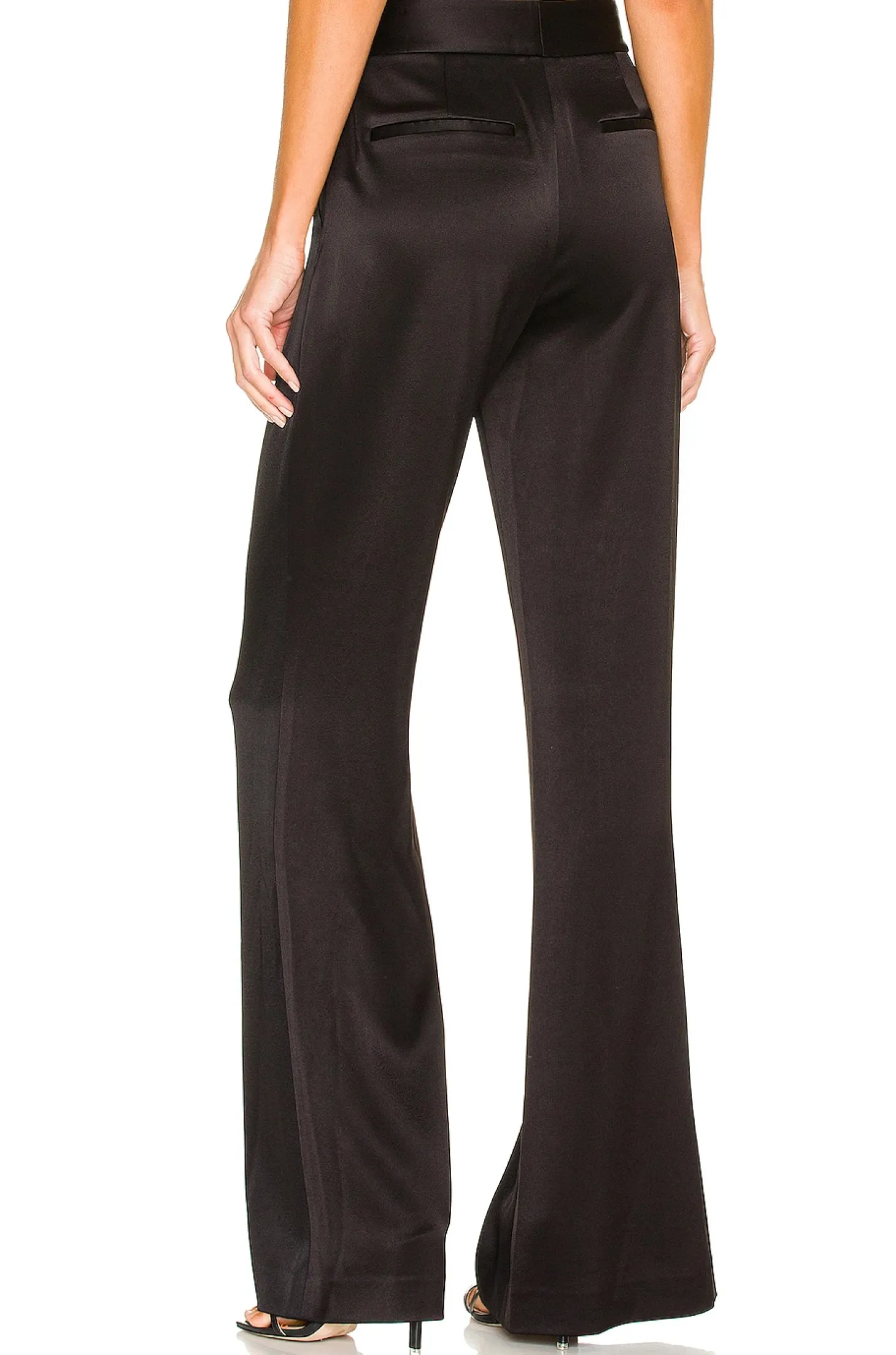 Self: 75% triacetate 25% poly Lining: 100% poly.Made in Vietnam.Dry clean only.Zip fly with hook and bar closure.Front pintuck detail.Side seam pockets Back faux pockets.Satin fabric.18" at the knee breaks to 23" at the leg opening