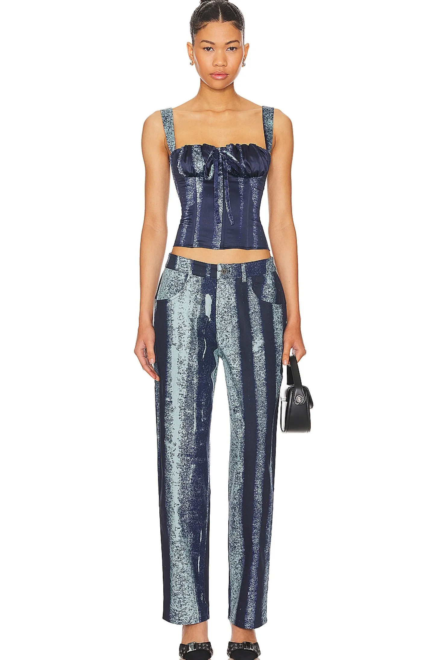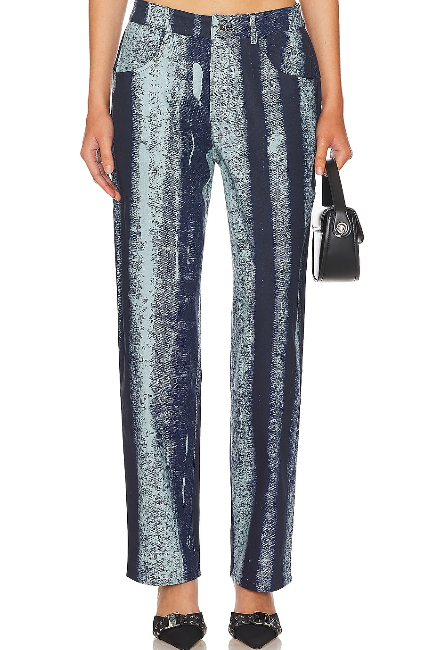 97% cotton 3% spandex.Made in China.Machine wash.Zip fly with button closure.5 pocket-styling.20" at the knee narrows to 14.50" at the leg opening