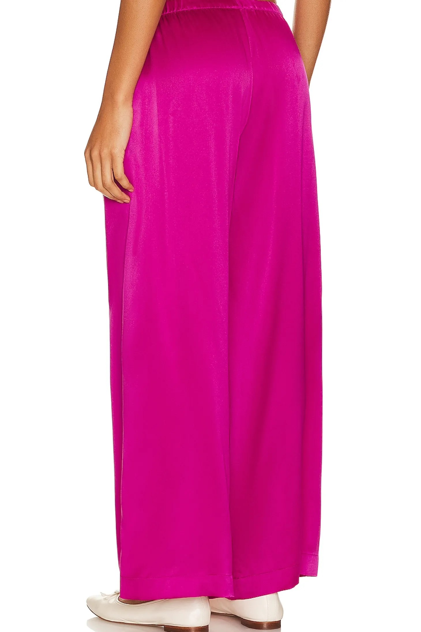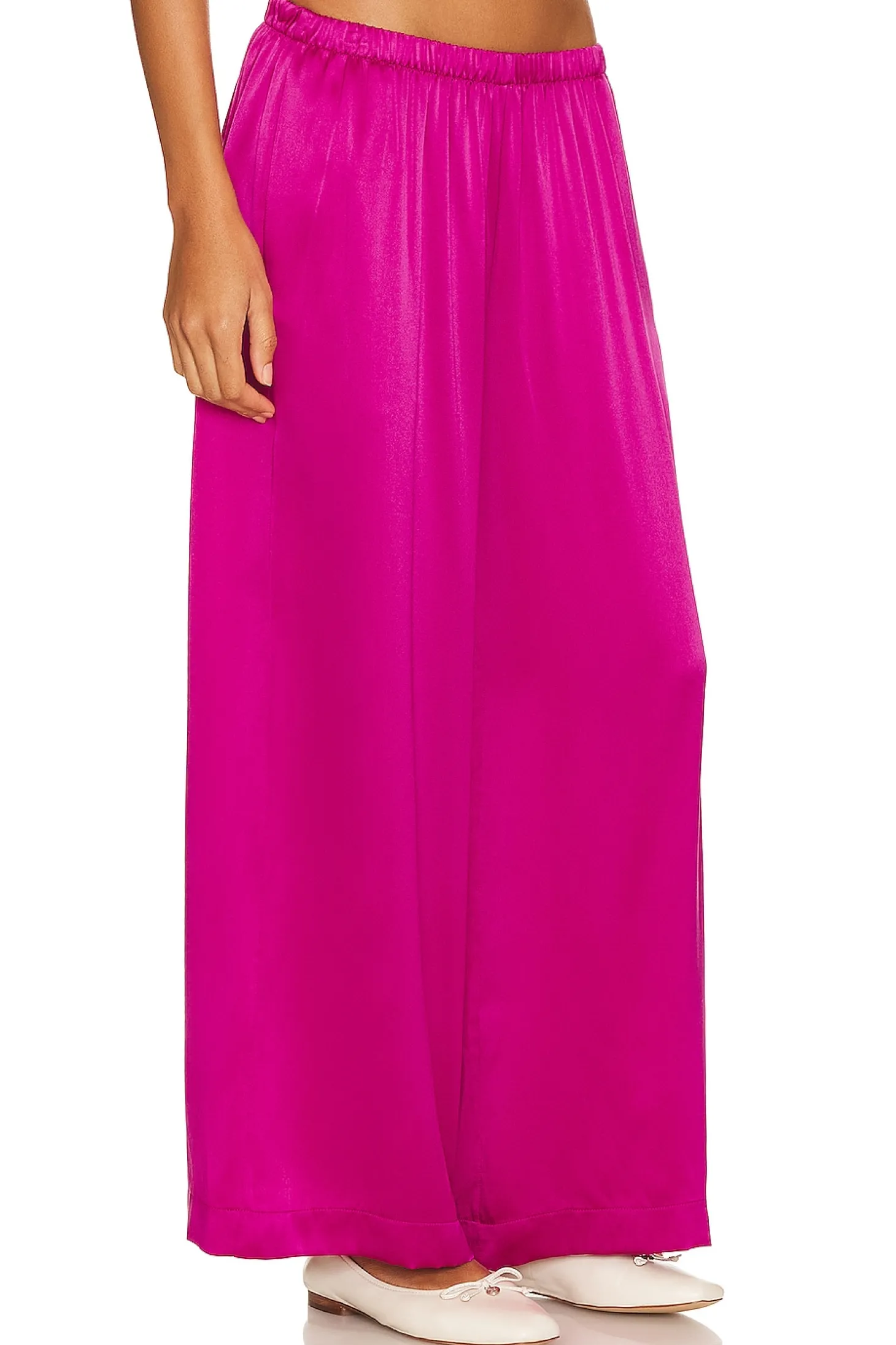 Viscose blend.Imported.Machine wash.Elastic waistband.Satin fabric.25" at the knee and 25" at the leg opening