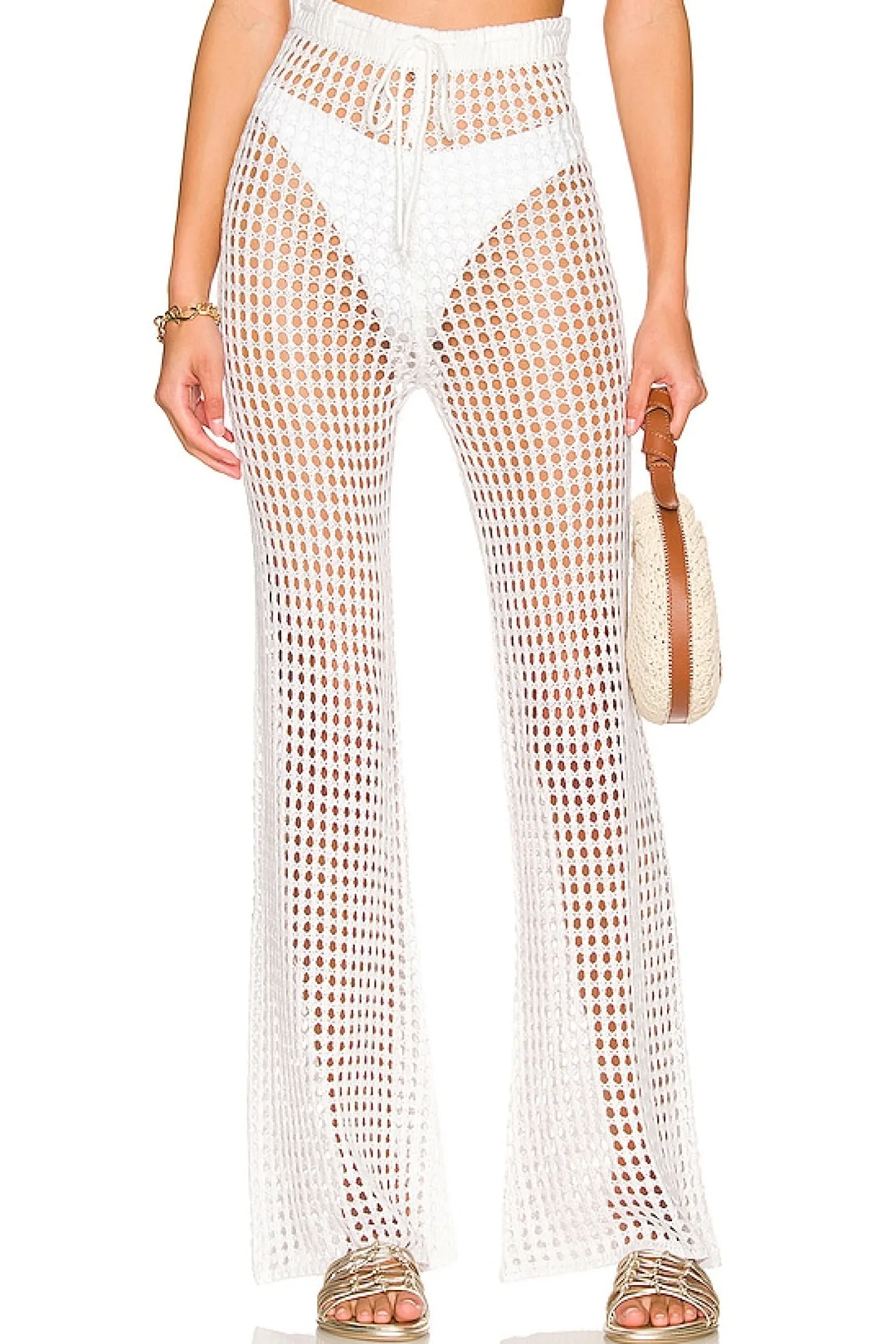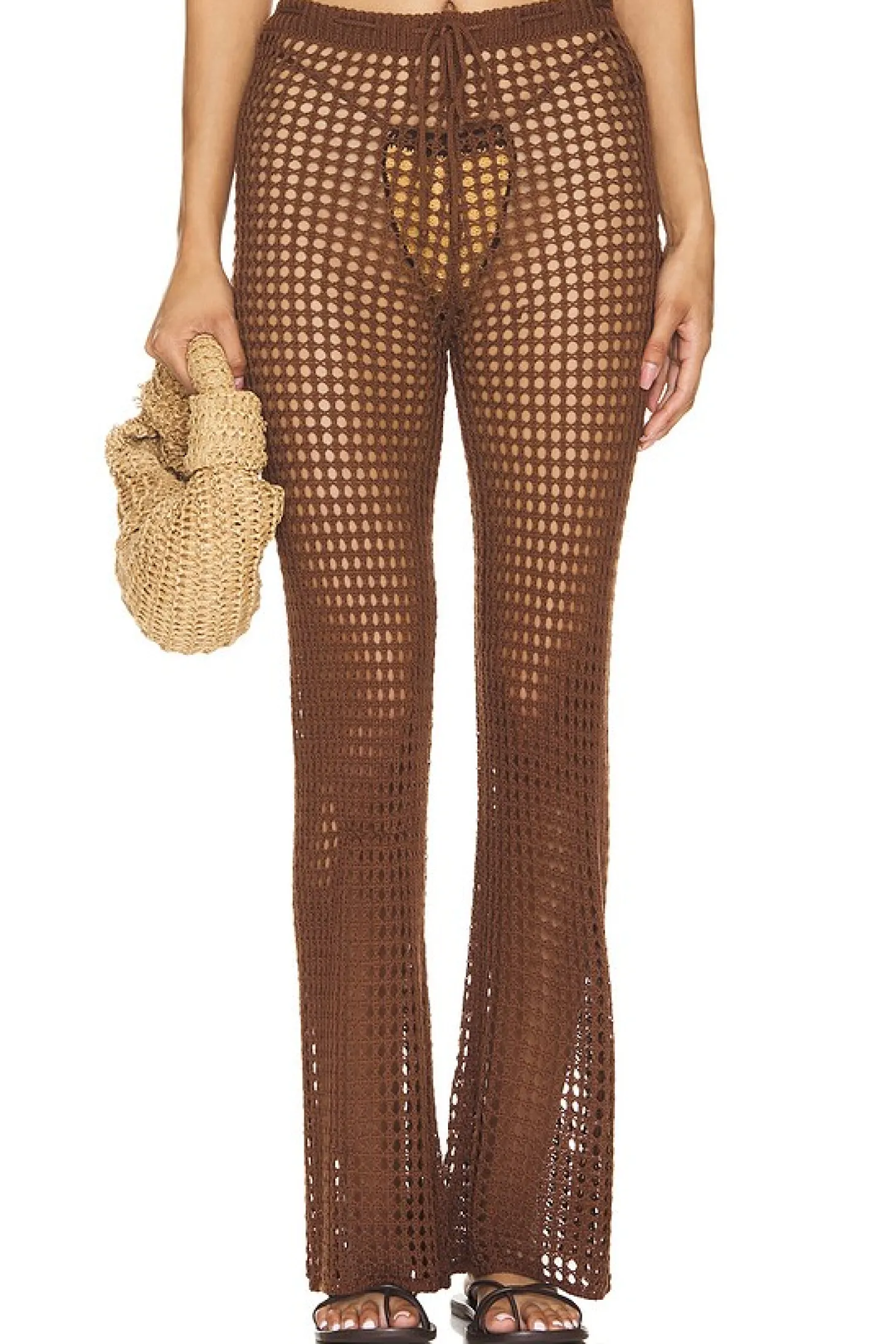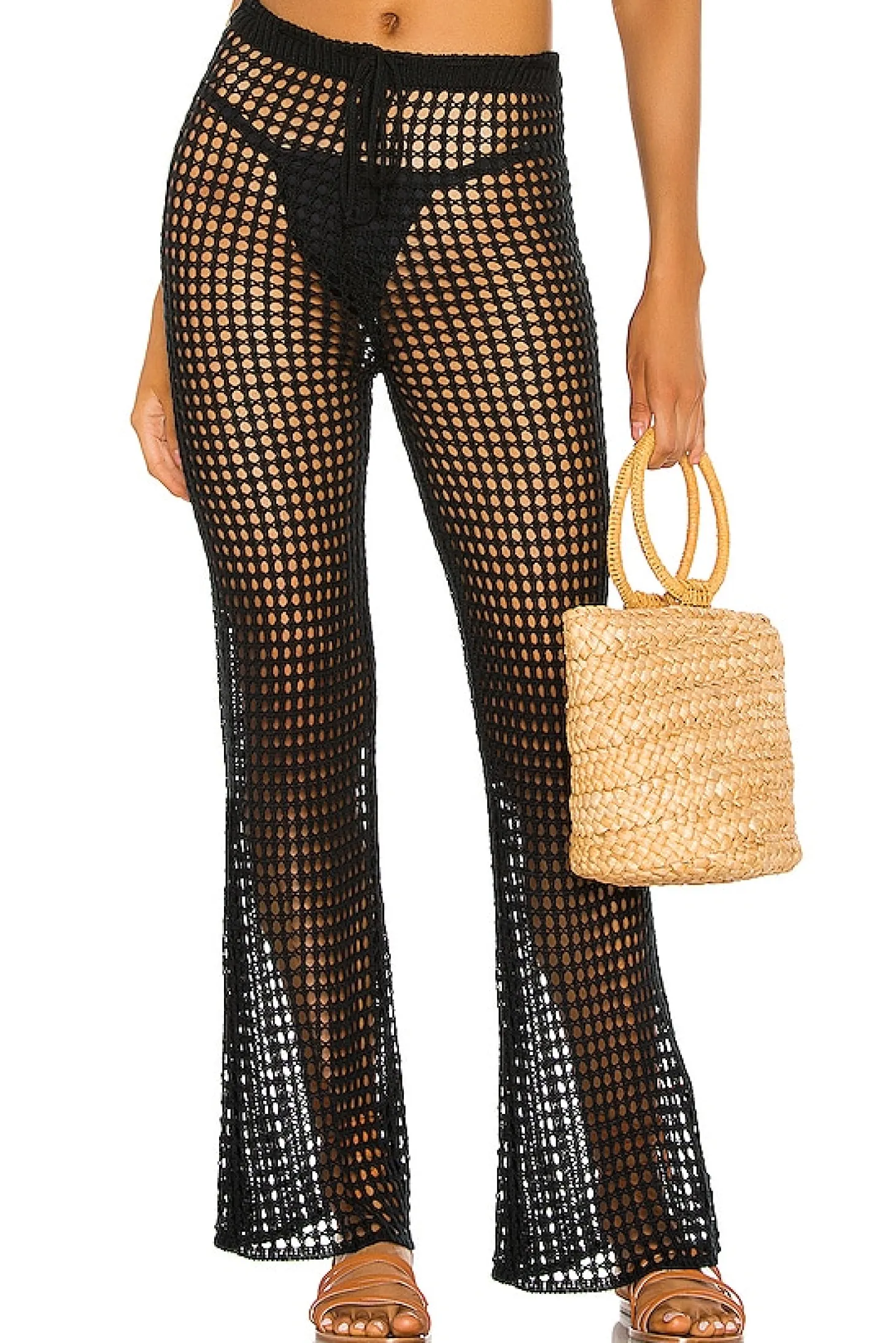 100% acrylic.Hand wash cold.Adjustable drawstring waist.Open knit fabric.Item not sold as a set.Imported