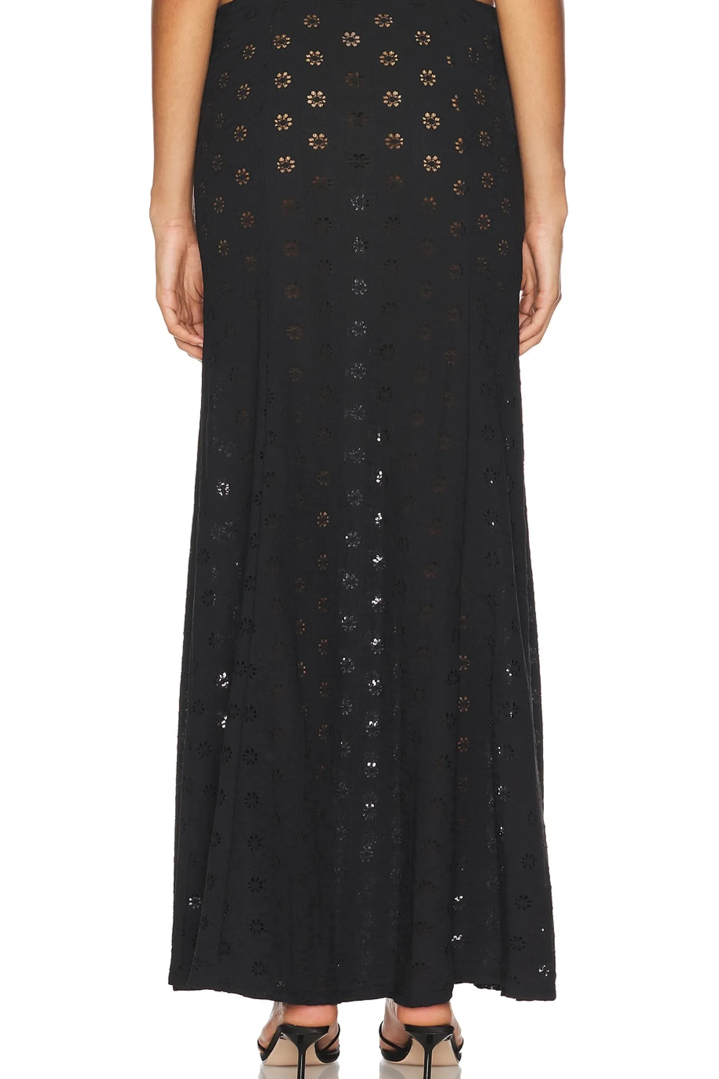 98% nylon 2% elastane.Made in China.Hand wash.Unlined.Pull-on styling with elastic waistband.Garment is made with a semi-sheer fabric, undergarments can show through.Item not sold as a set.Skirt measures approx 43" in length