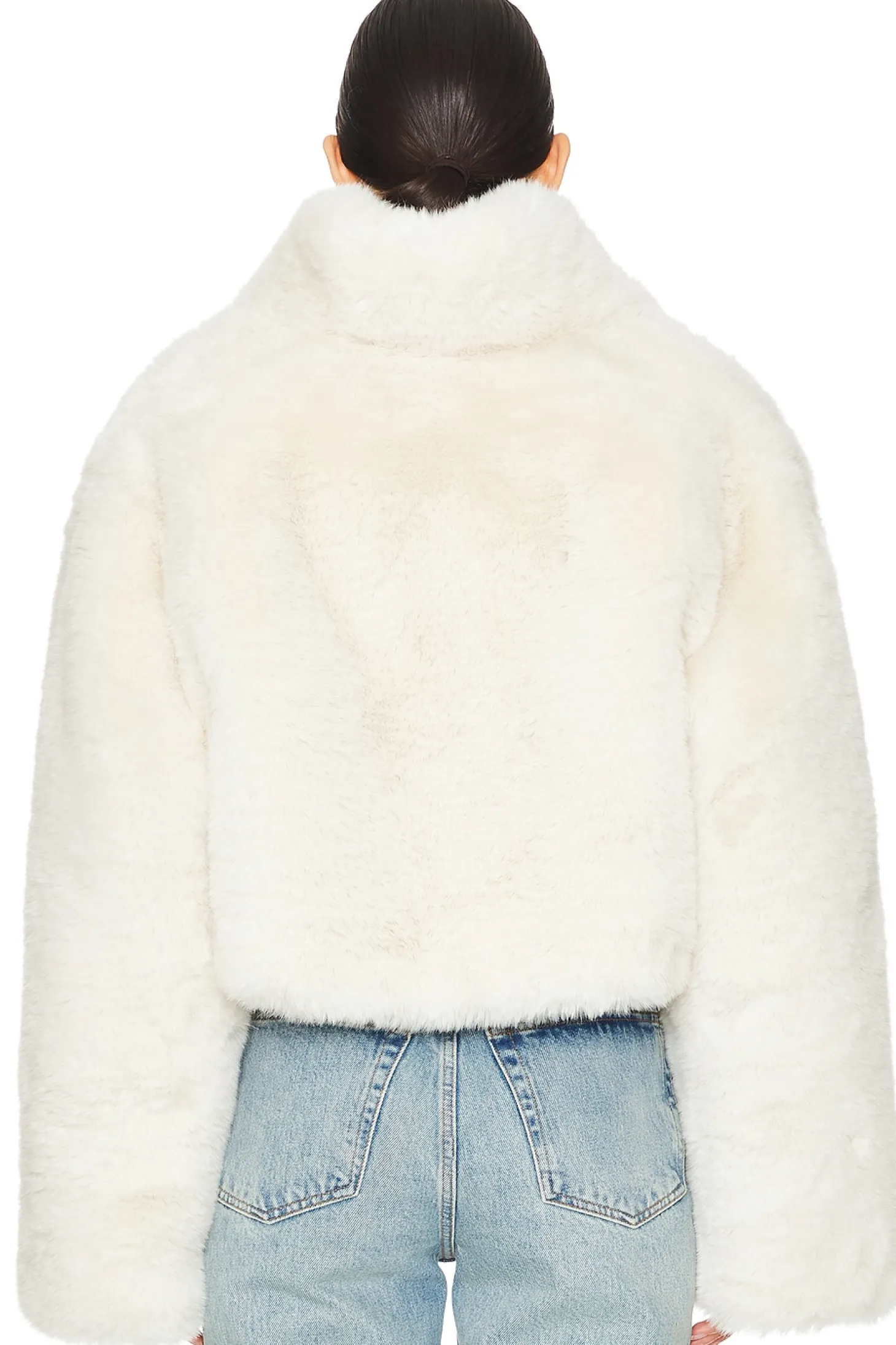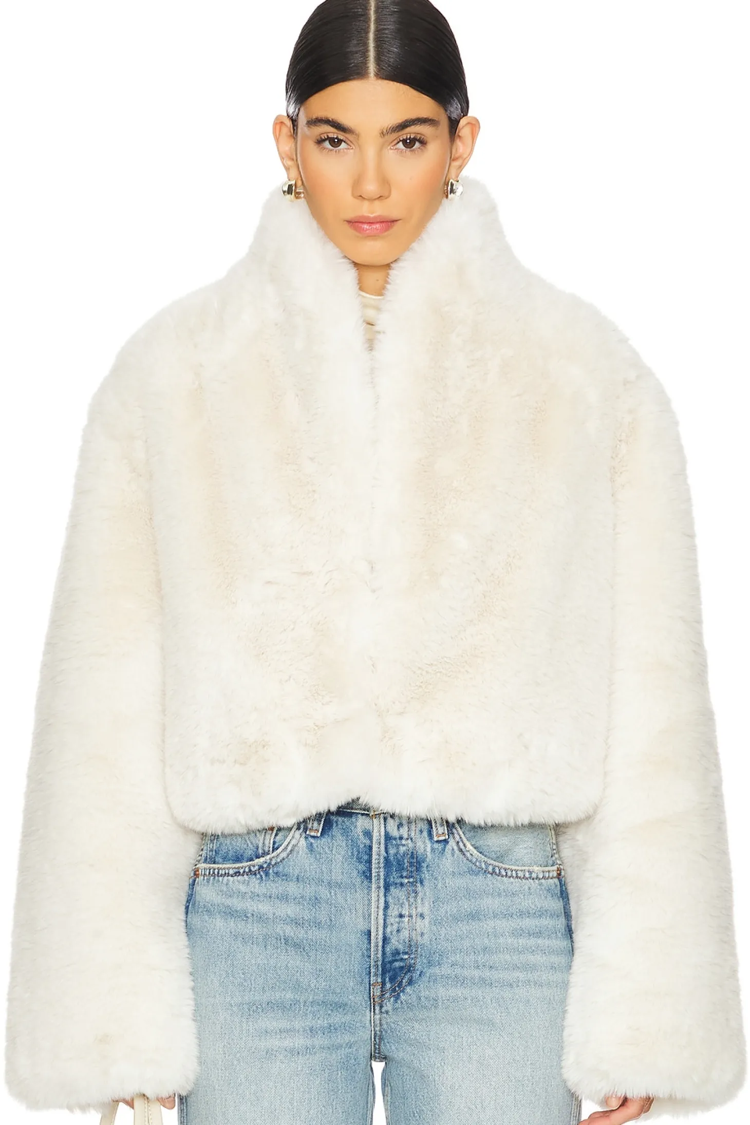 Self: 100% polyester Lining: 55% polyester 45% viscose.Made in China.Dry clean only.Front hook and eye closure.Heavyweight faux fur fabric