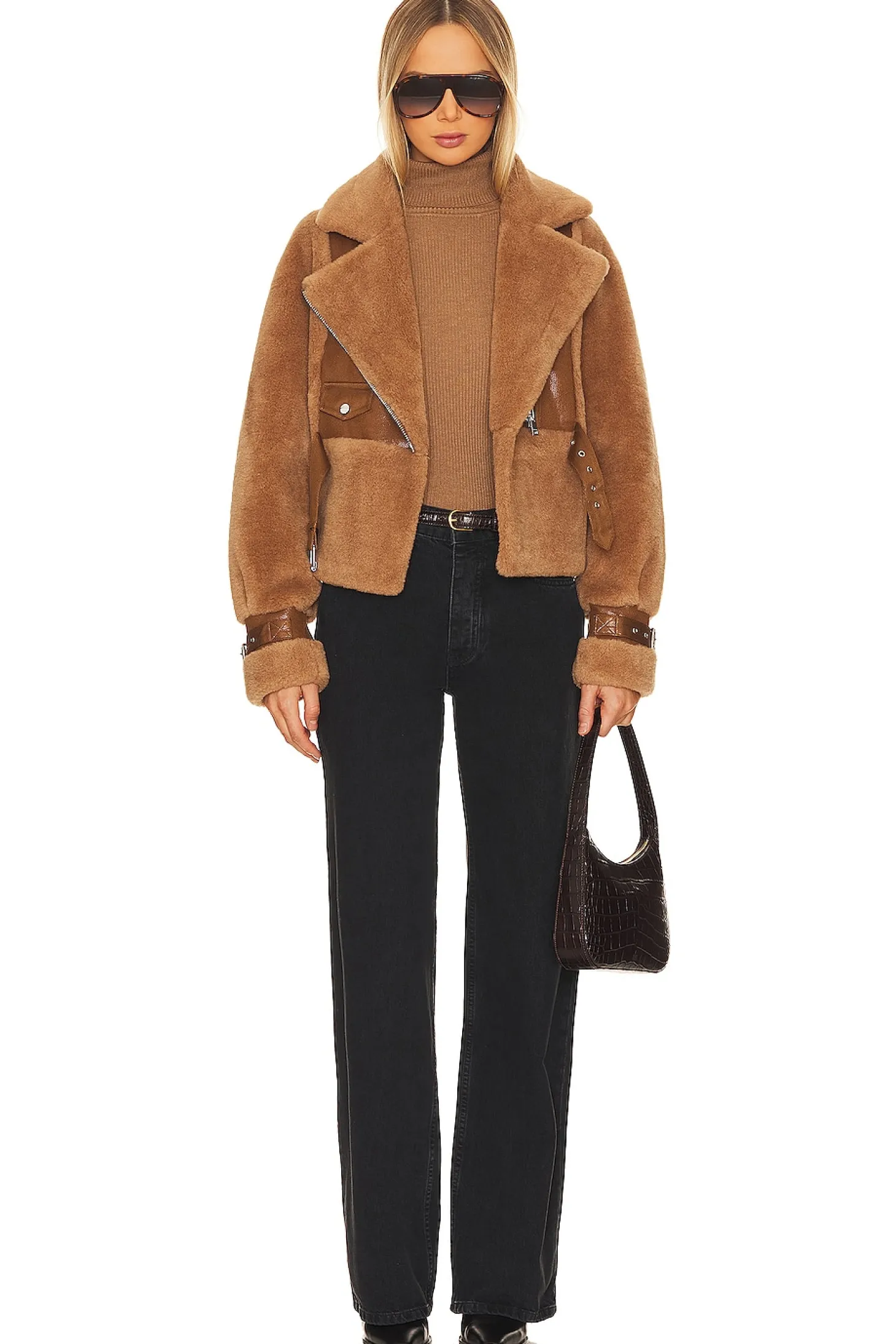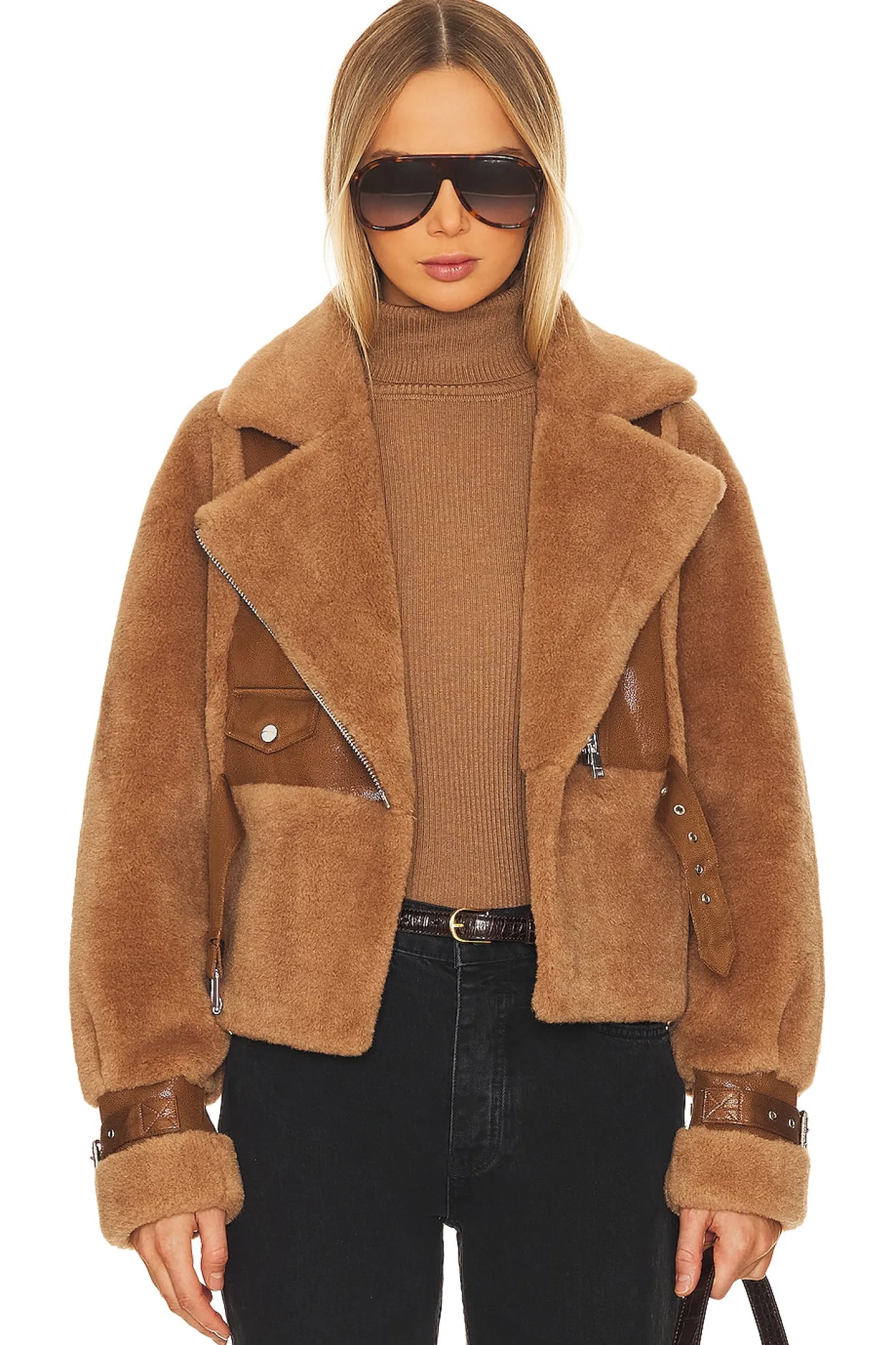100% polyester.Made in China.Dry clean only.Front zipper closure.Attached waist belt with buckle closure.4-pocket styling.Belted cuffs.Faux fur fabric.The coziest faux fur jacket, designed to keep you warm from the chalet to the city.