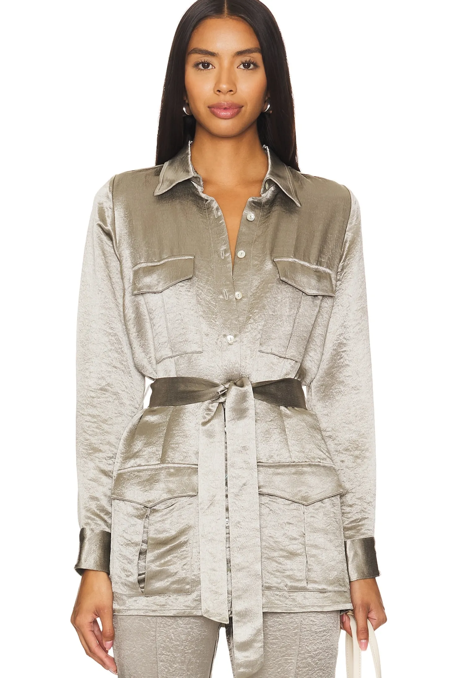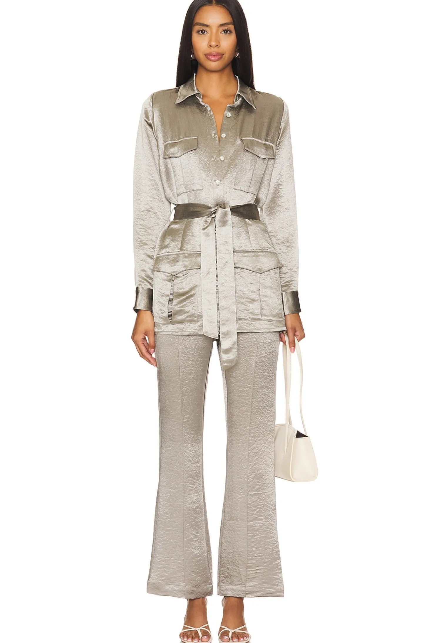 Sateen textile.Imported.Dry clean recommended.Front button closure with optional waistbelt.Four front cargo pockets.Buttoned cuffs.Textured sateen fabric.Item not sold as set