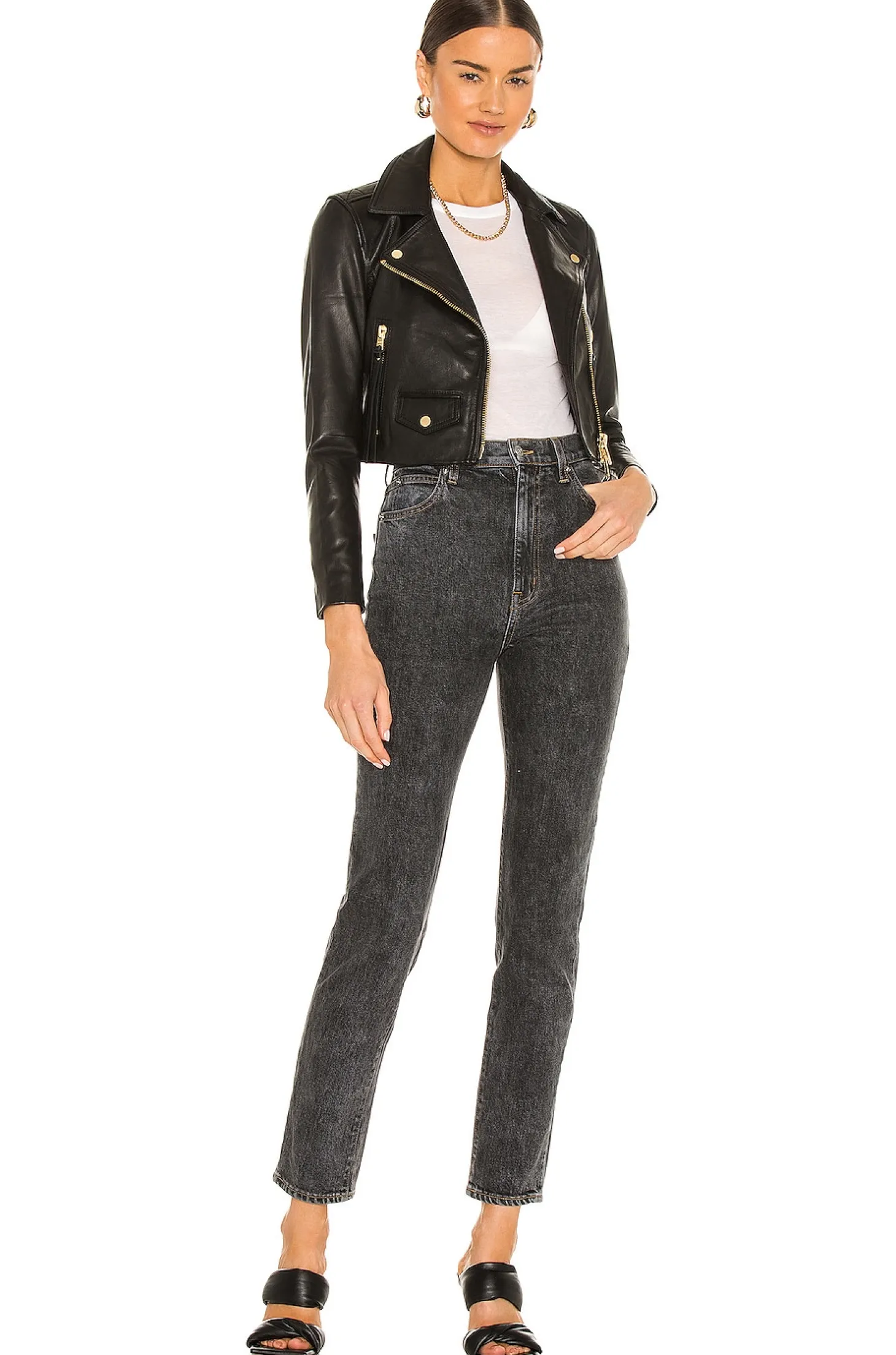 Self: 100% lamb leather Lining: 100% polyester.Made in India.Professional leather clean only.Two-way front zipper closure.Zipper pockets.Notched lapels with snap button closure