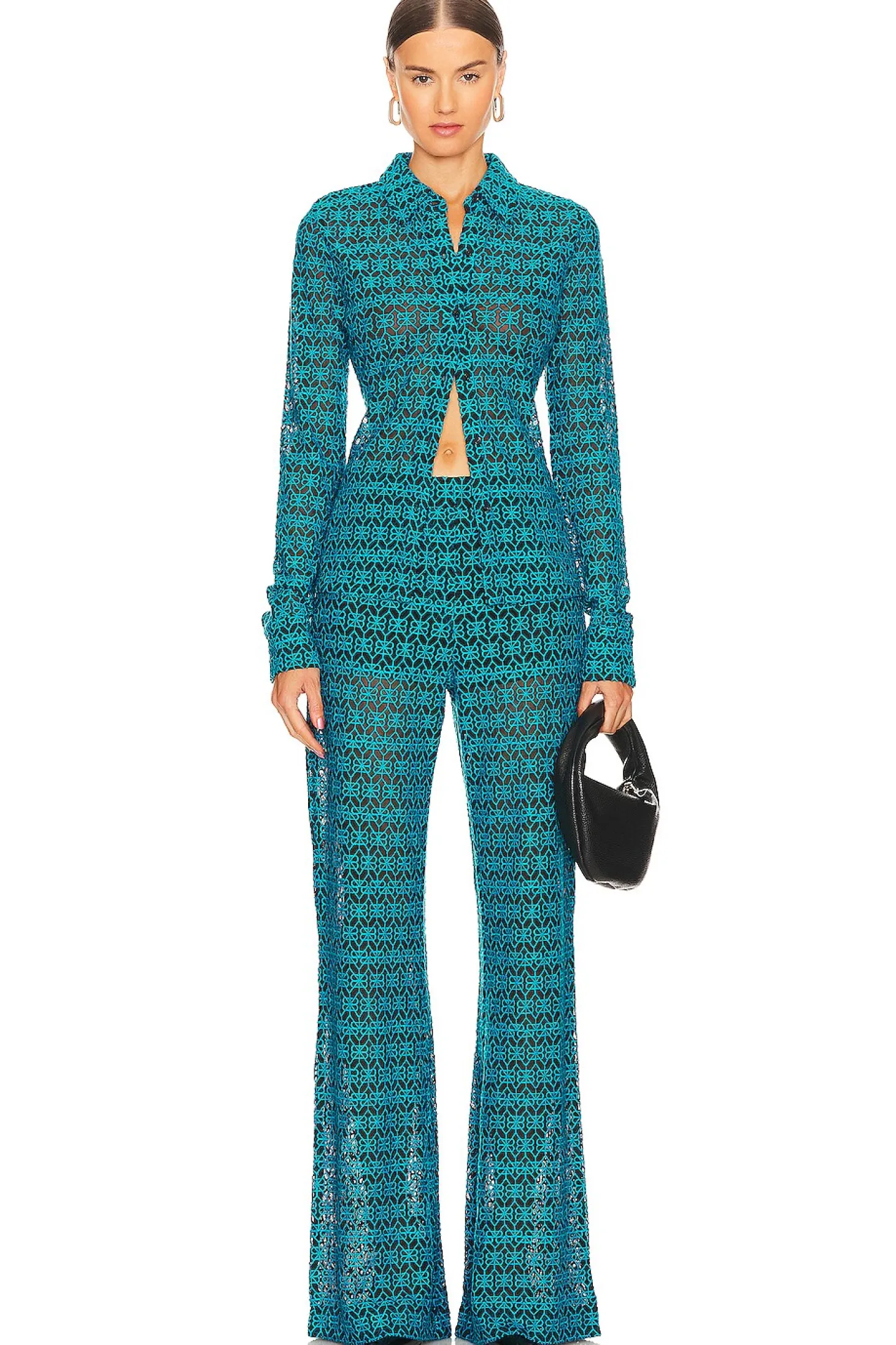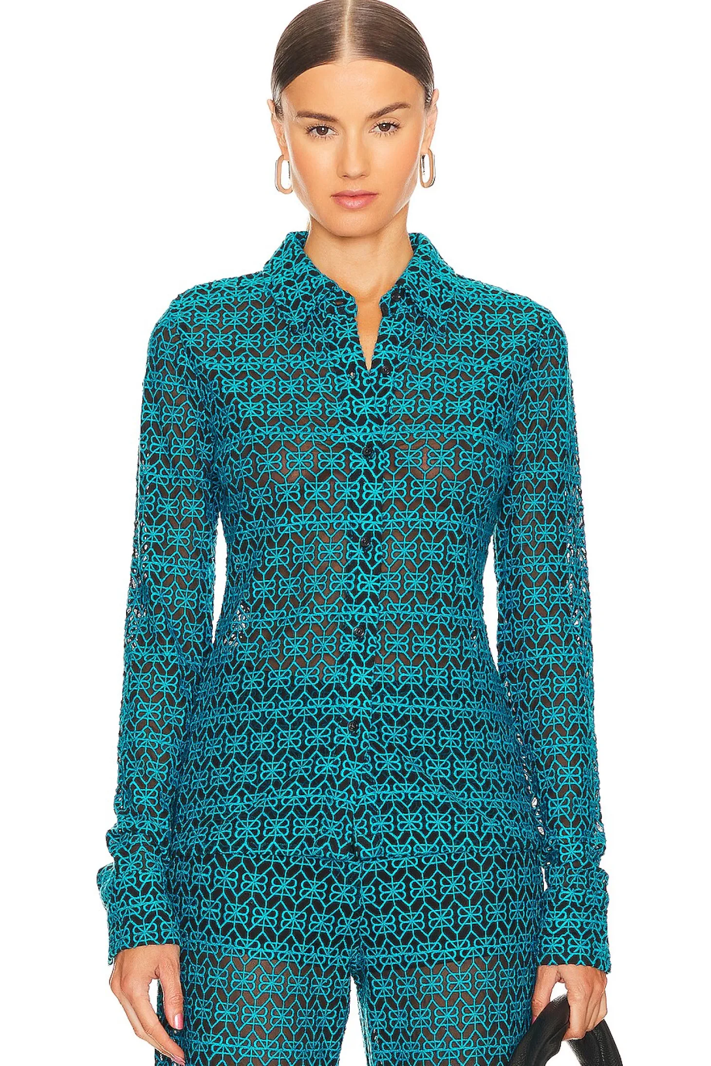 85% viscose 15% polyester.Made in China.Hand wash.Front button closure.Button cuffs.Embroidery detail throughout.Mesh fabric.Item not sold as a set