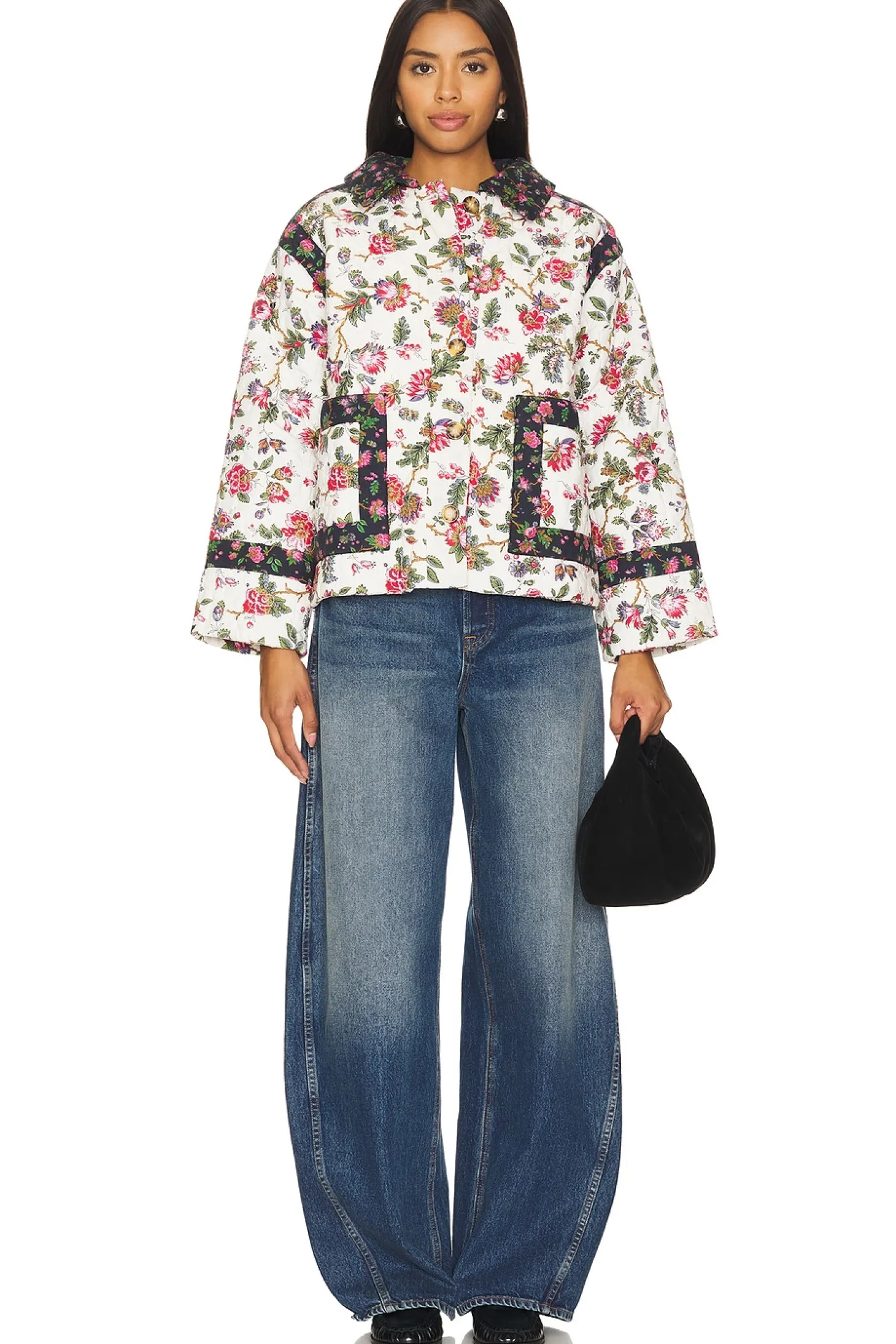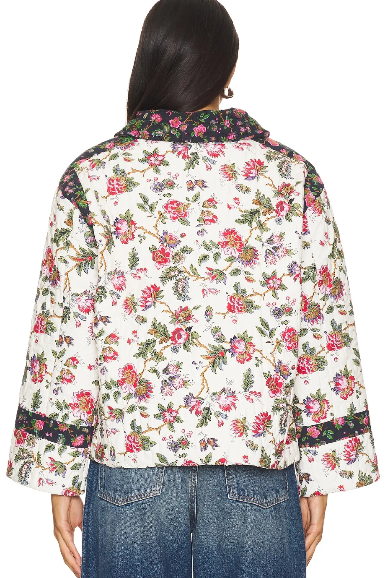 Self & Lining: 100% organic cotton Fill: 100% polyester.Made in India.Dry clean only.Front button closure.Side tab pockets.Quilted voile fabric