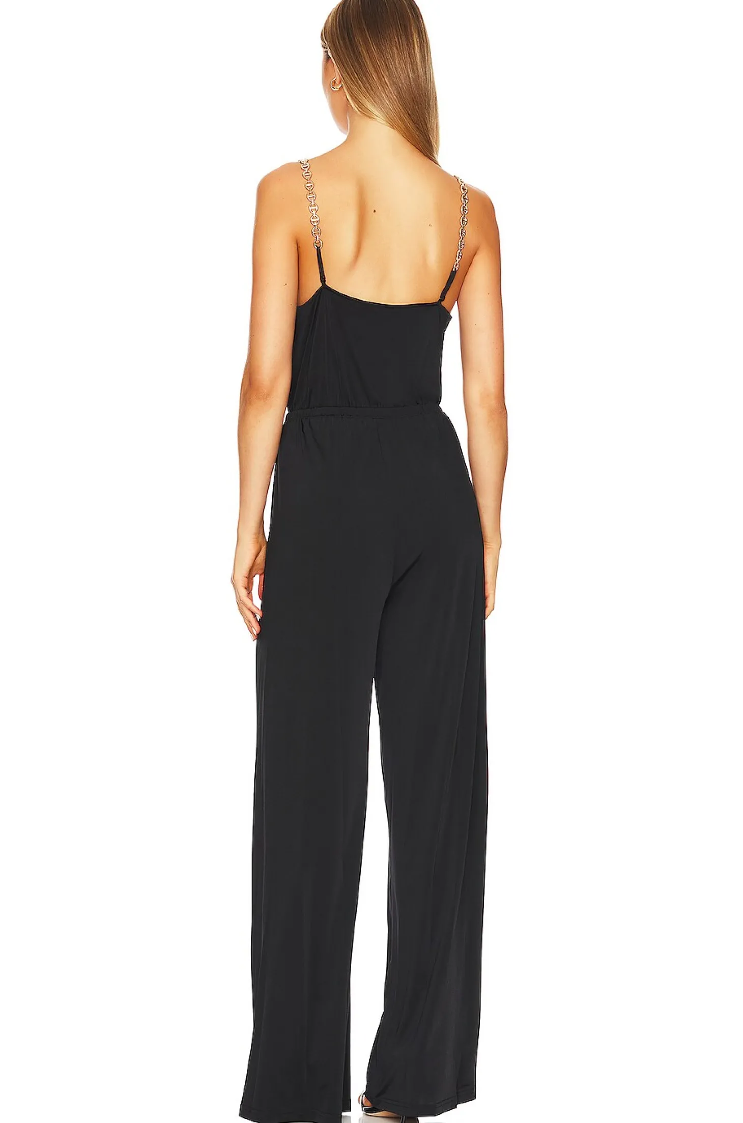 94% polyester 6% spandex.Made in China.Dry clean only.Pull-on styling.Gold-tone chainlink shoulder straps.Cowl neckline.Side slip pockets