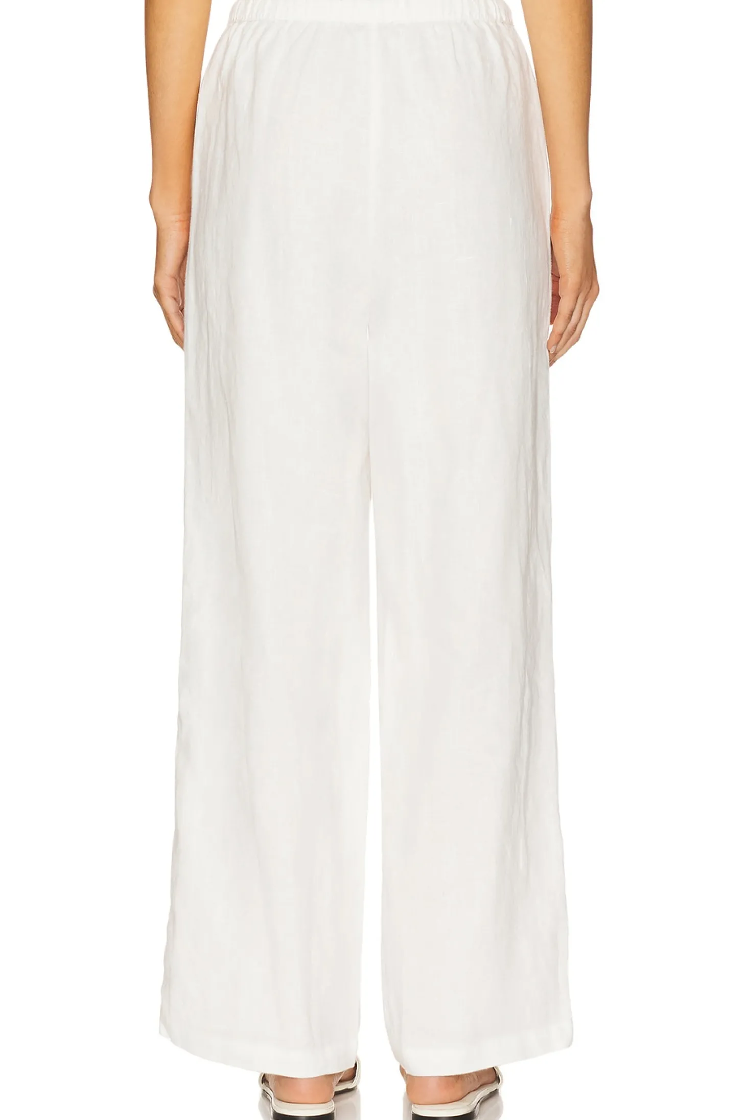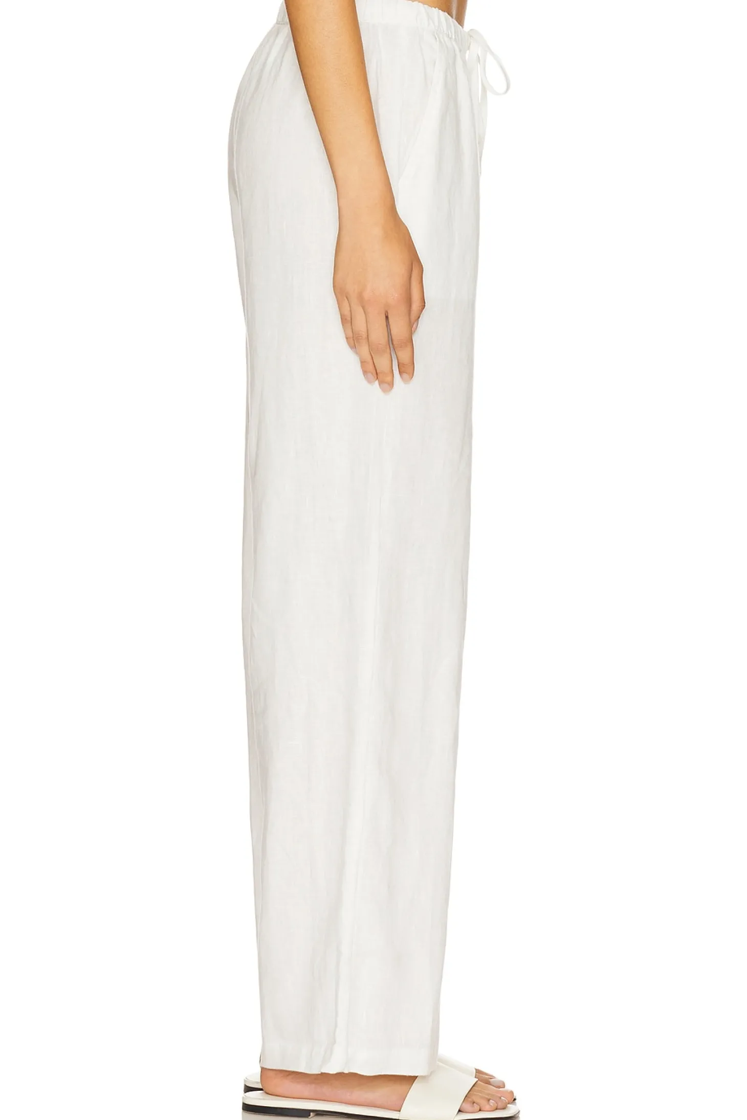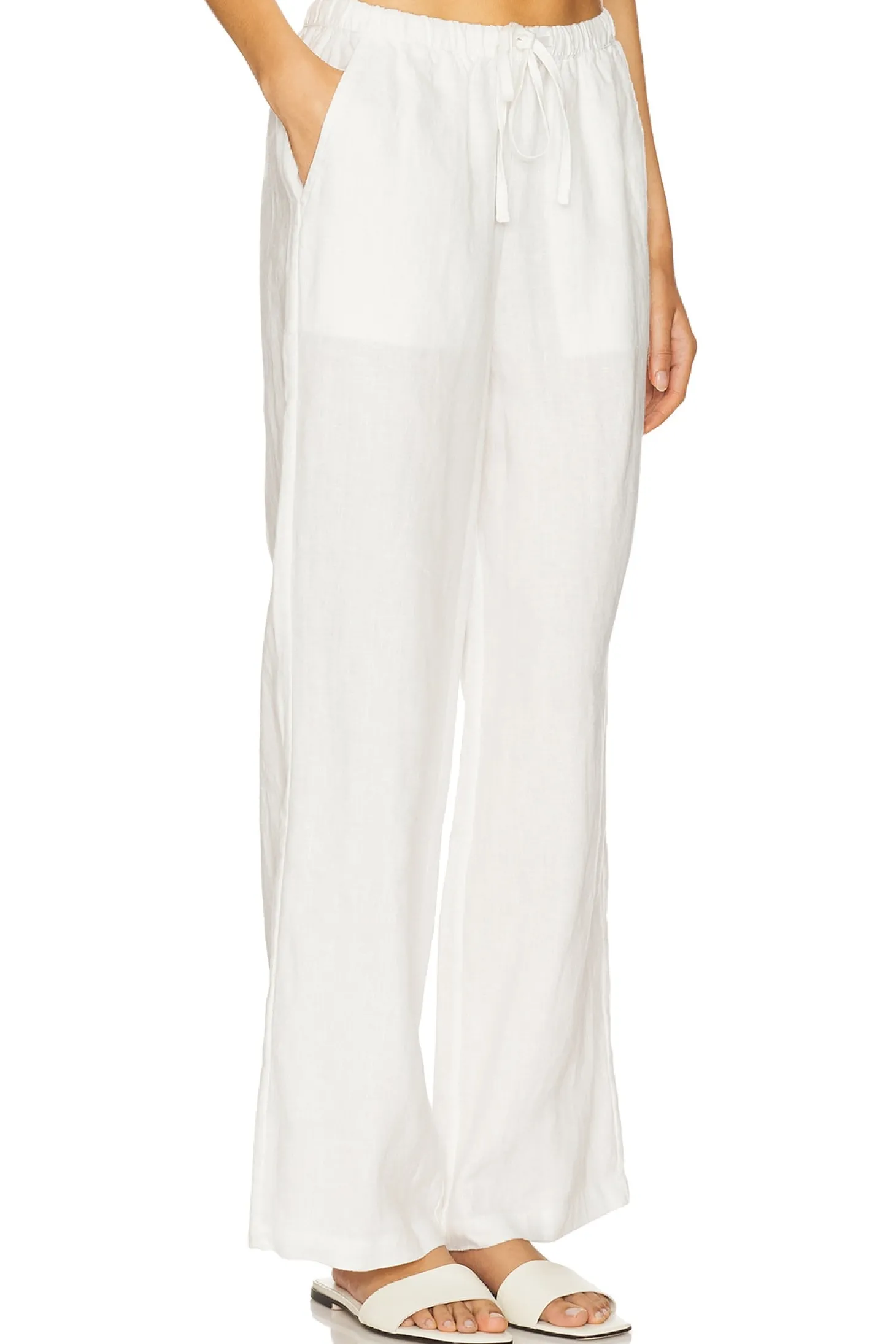 100% linen.Made in China.Dry clean only.Drawstring waist.Side slant pockets.Lightweight linen fabric.20" at the knee and 20" at the leg opening