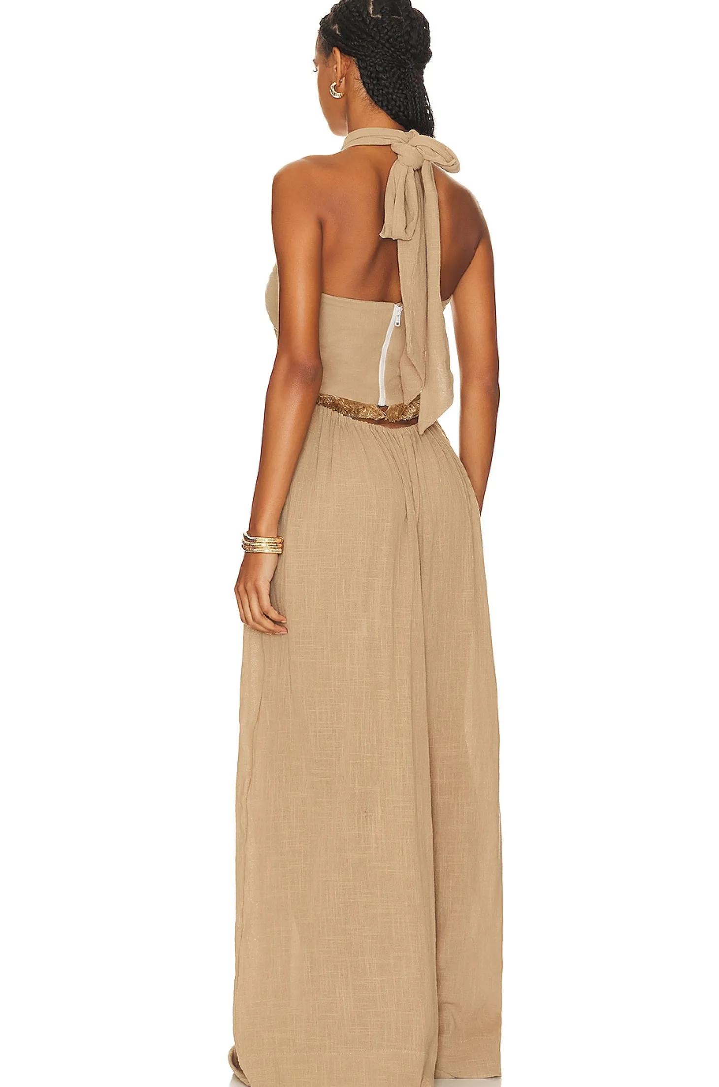 100% cotton.Made in USA.Machine wash.Exposed back zipper closure.Halterneck styling with tie closure.Bust cut-out.Lightweight linen gauze fabric with fringe trim