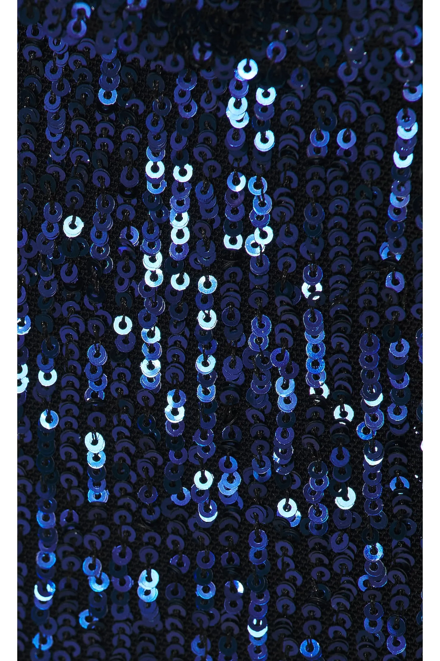 Self: 95% nylon 5% spandex Lining: 95% polyester 5% spandex.Made in Australia.Hand wash.Hidden back zipper closure.Halterneck styling with button loop closure.Fully sequin fabric with draped bodice