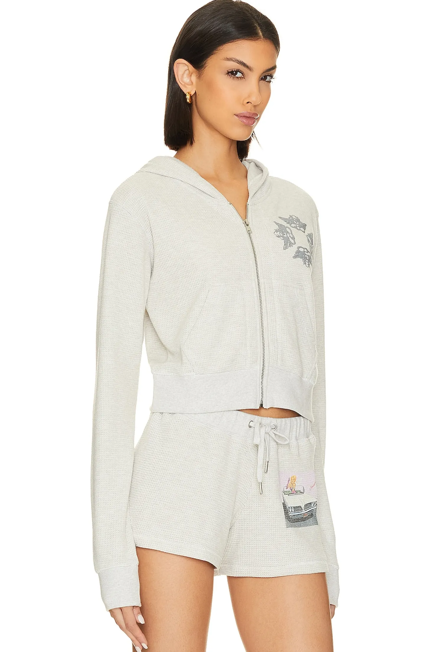 68% polyester 29% rayon 3% spandex.Made in China.Machine wash.Front zipper closure.Attached hoodie.Front and back print graphic.Side slant pockets.Lightweight thermal fabric Item not sold as set