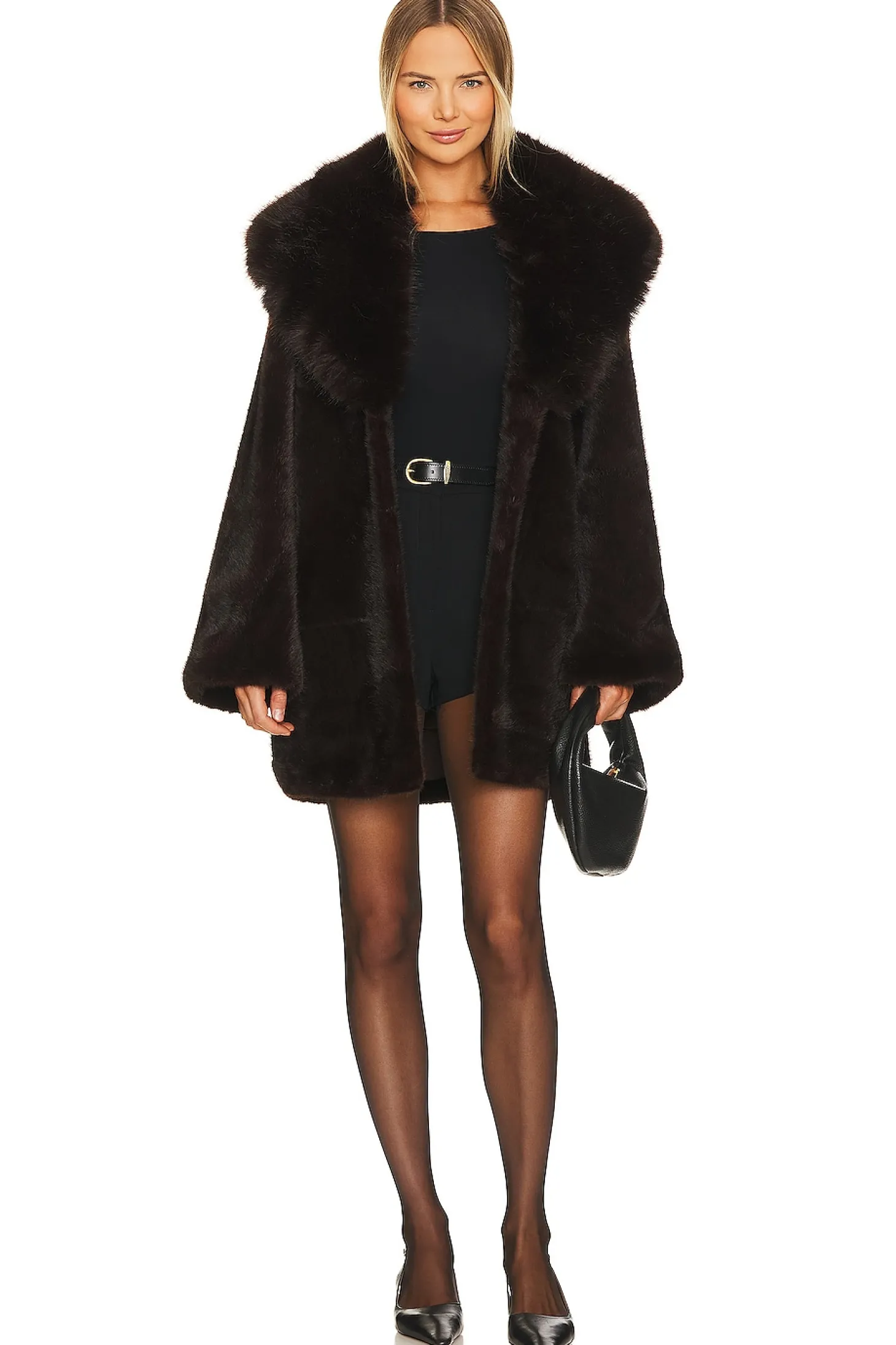 100% polyester.Made in China.Dry clean only.Front hook and eye closure.Side seam pockets.Heavyweight faux fur fabric