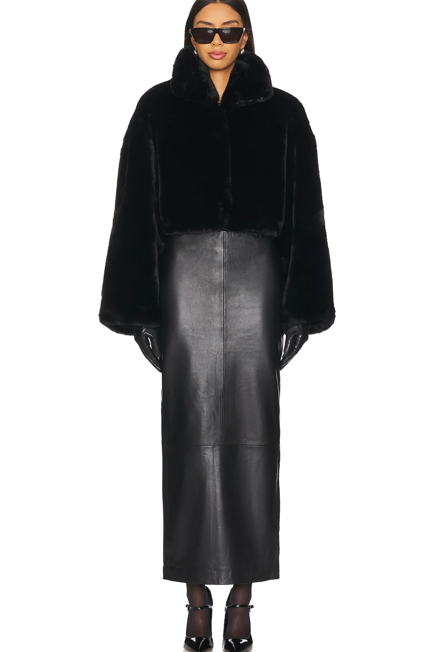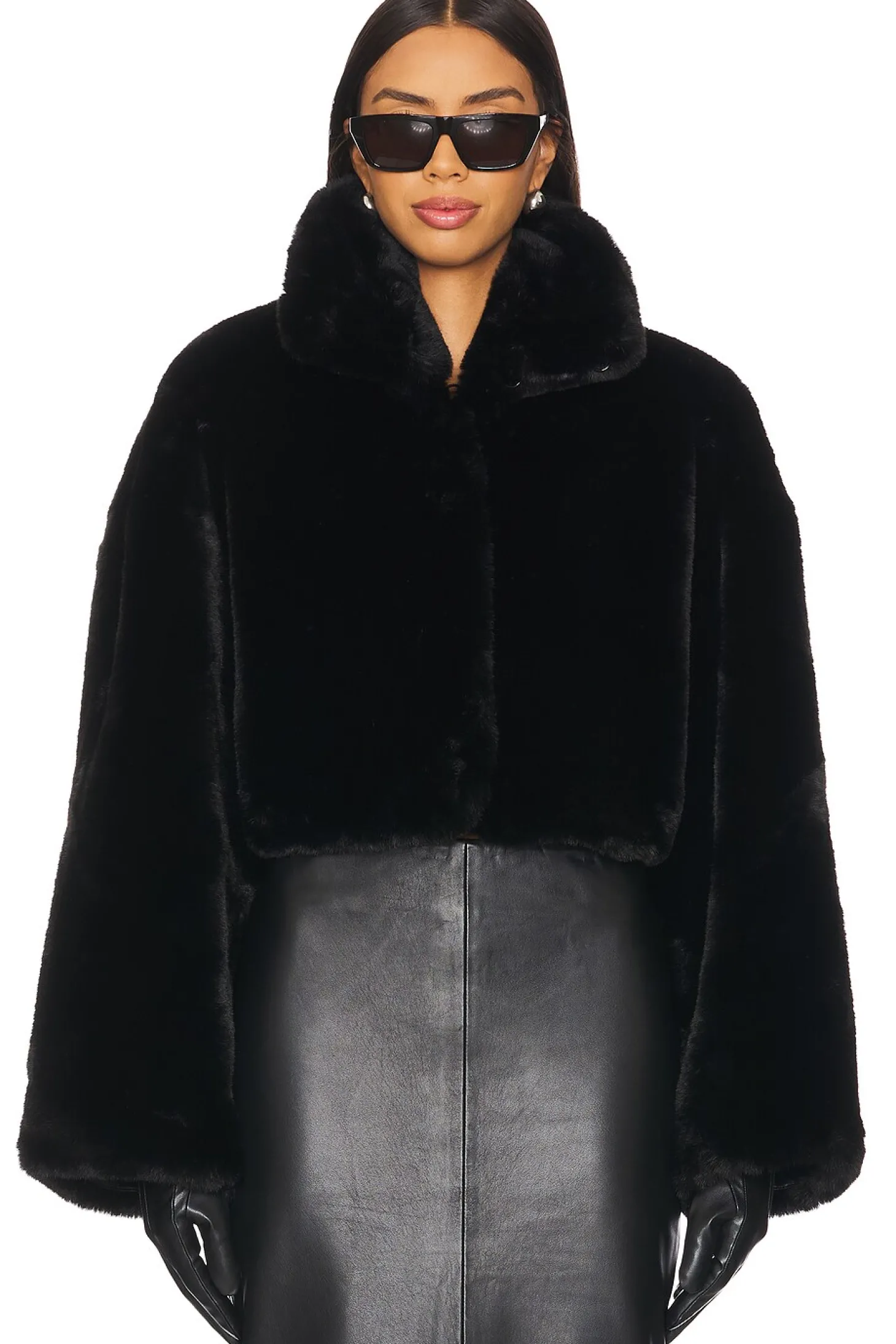 Self & Lining: 100% polyester.Made in China.Dry clean only.Front hook and loop closure.Soft faux fur fabric with spread collar.Cropped styling